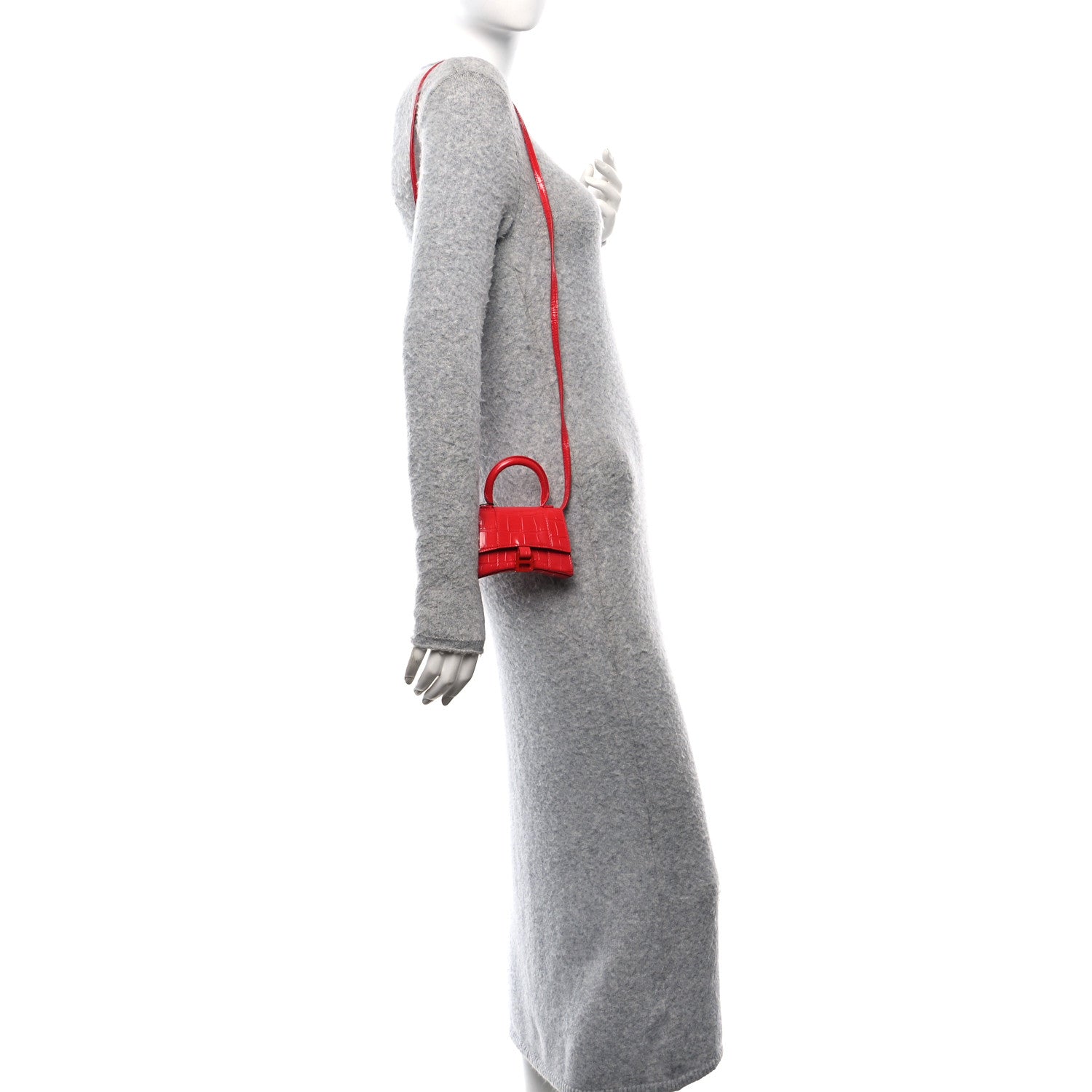 Shiny Calfskin Tonal B Crocodile Embossed Hourglass Top Handle Bag Mini Bright Red