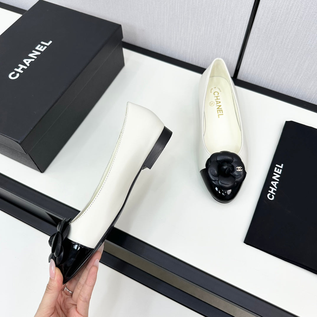 ballet flat flower cream calfskin black patent calfskin