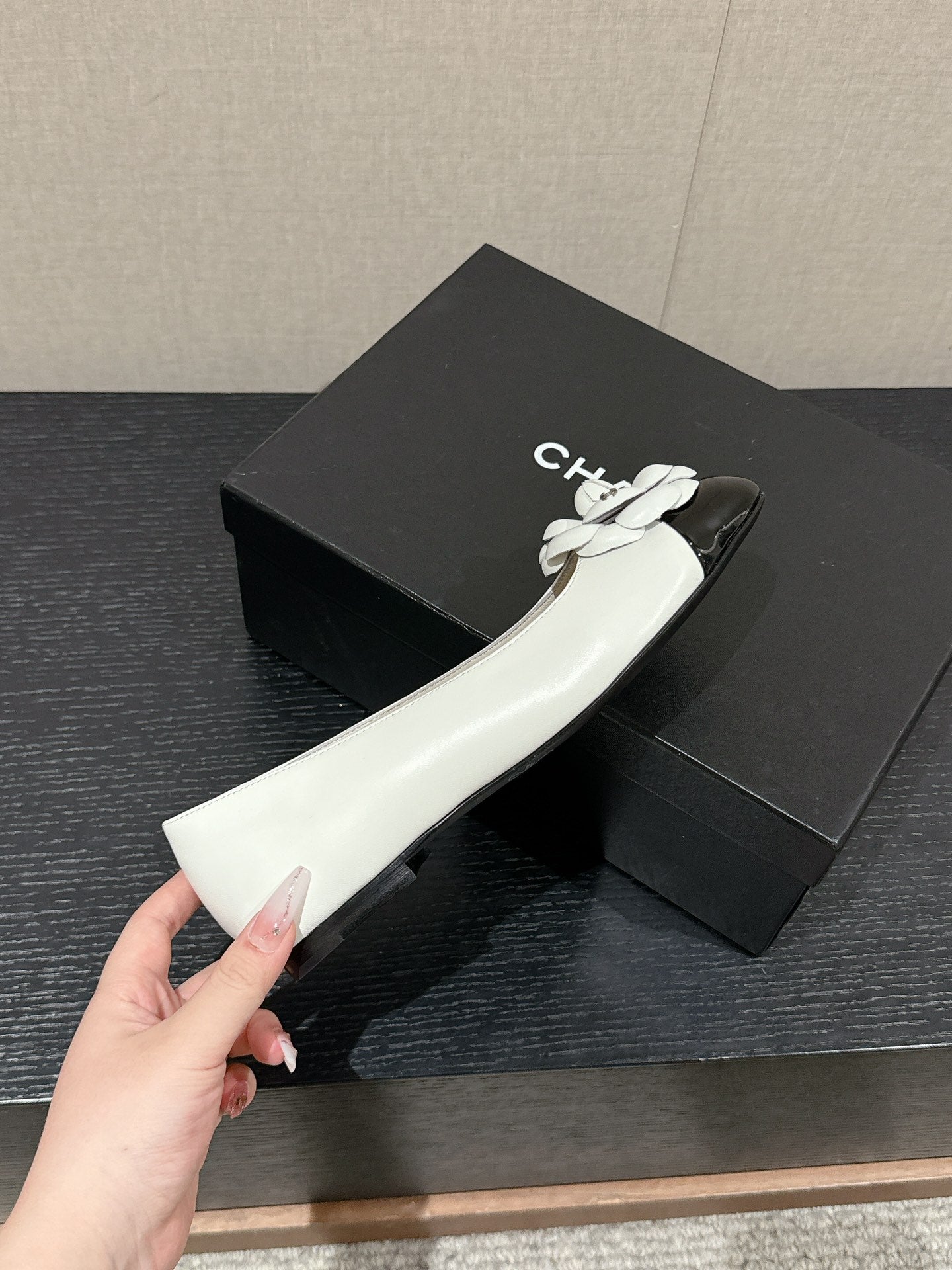 ballet flat flower white calfskin black patent calfskin