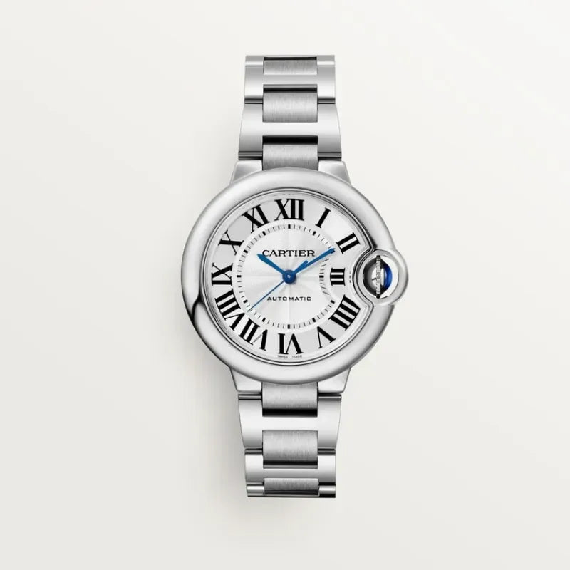 Roman numerals are guided on their path by a deep blue winding mechanism. The convex curves of the case, guilloché dial, sword-shaped hands, and polished or satin-finish links of the bracelet ensure that the Ballon Bleu watch by Cartier floats within the world of Cartier watchmaking.