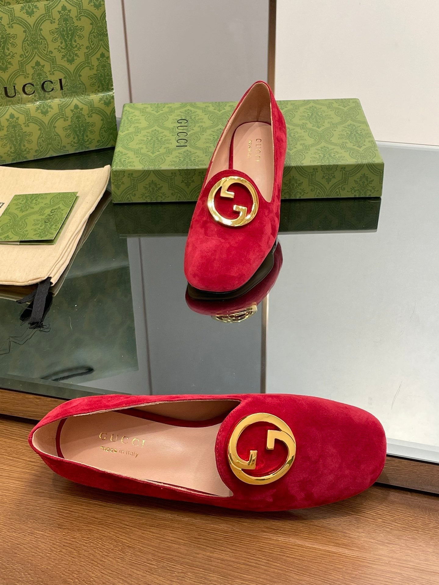 BLONDIE LOGO-PLAQUE LOAFERS IN CRIMSON RED SUEDE