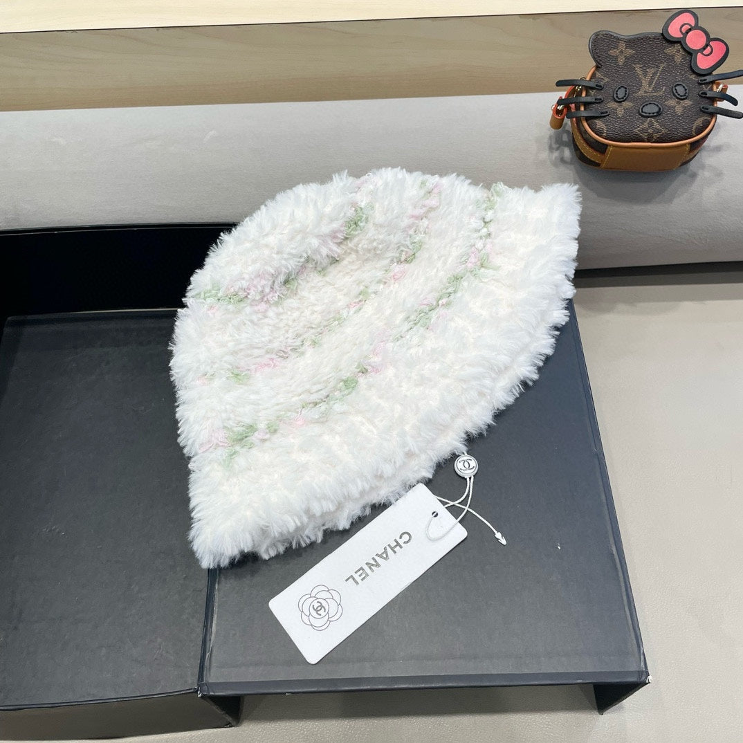 • Stylish plush bucket hat for women, suitable for autumn and winter, designed for warmth with a mixed-color look.