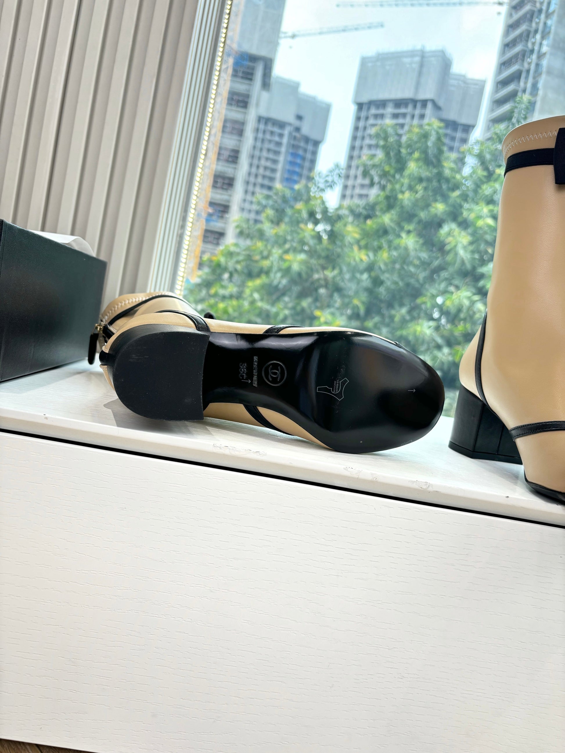 CC 25 Short Boot Beige Calfskin Black Bow 430318