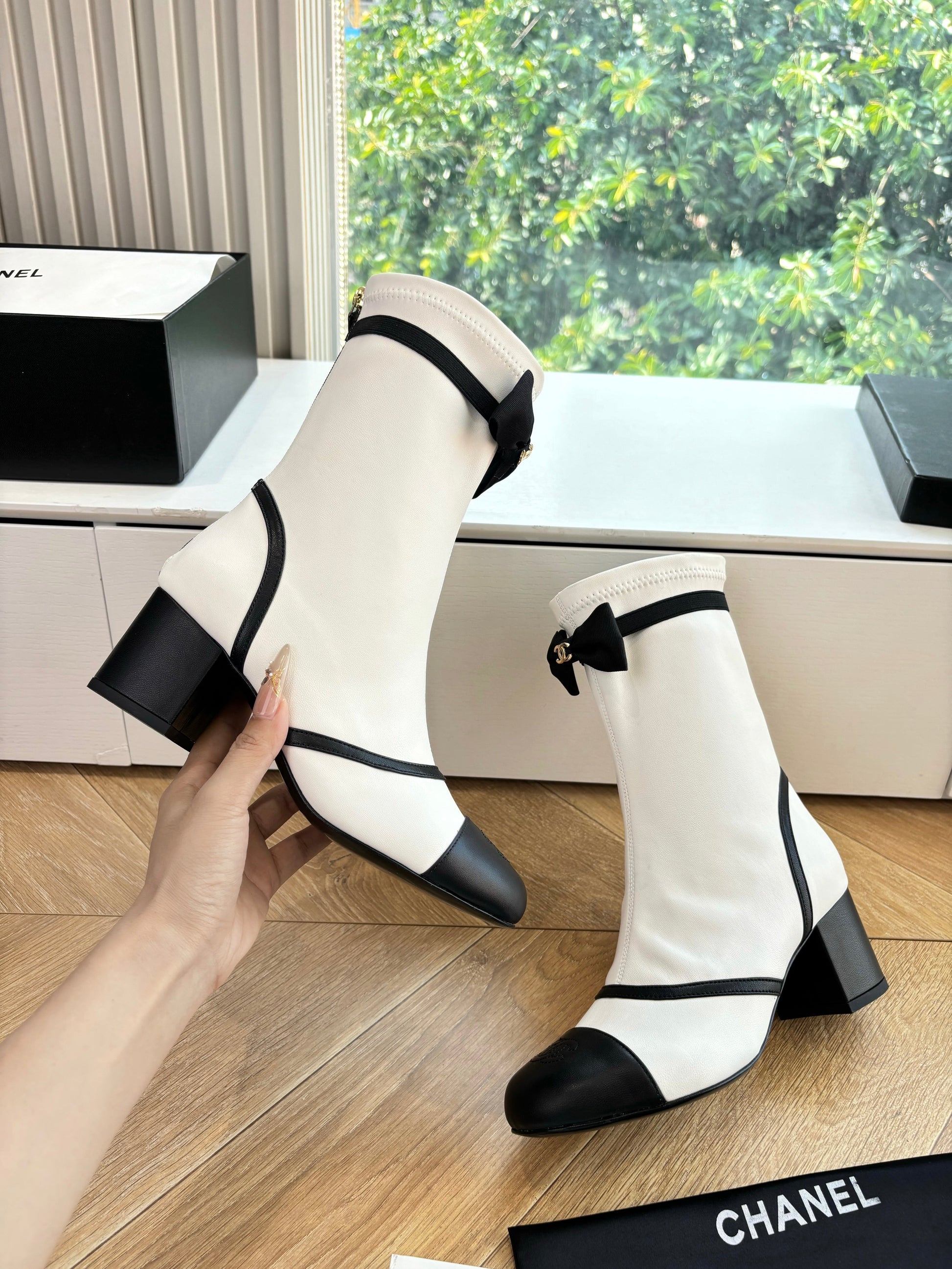 CC 25 Short Boot White Calfskin Black Bow 430317