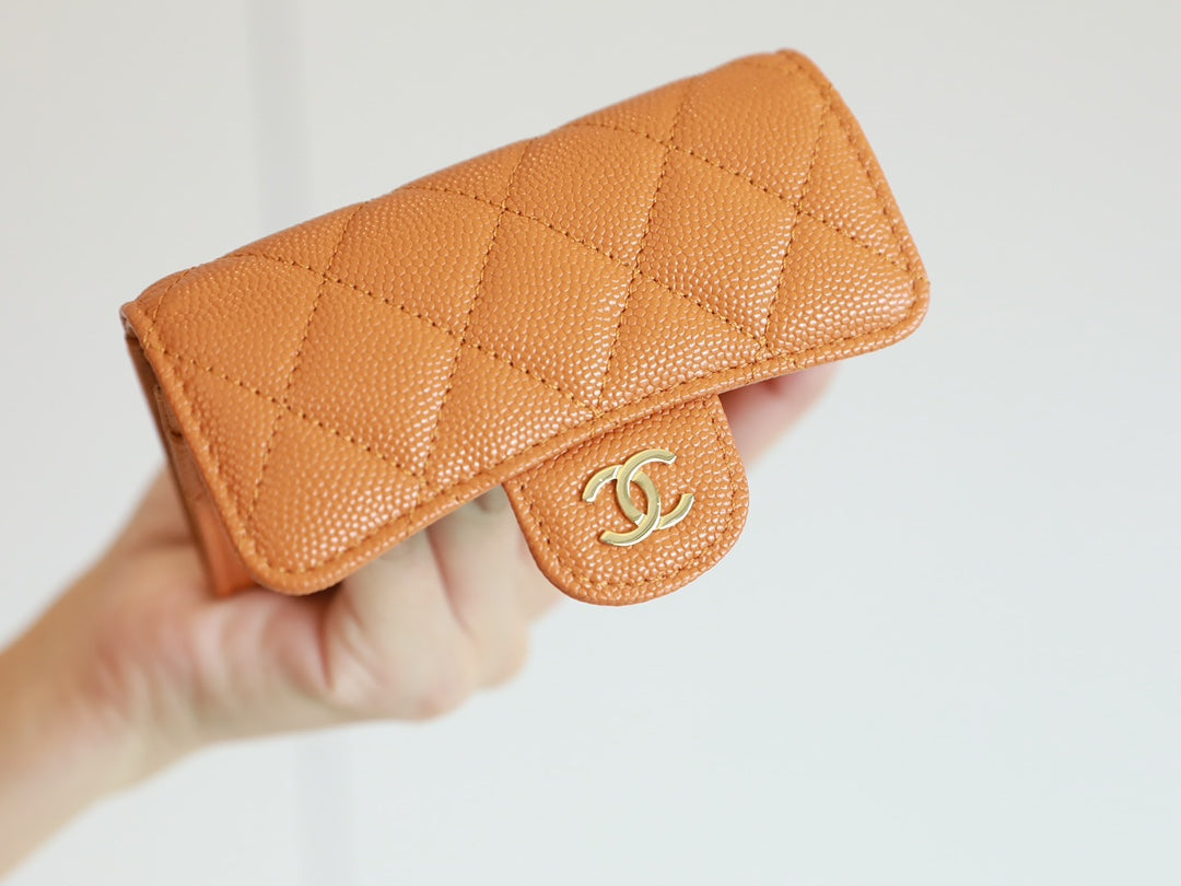 CC FLAP CARD HOLDER 11.3 ORANGE GRAINED CALFSKIN GOLD ICON