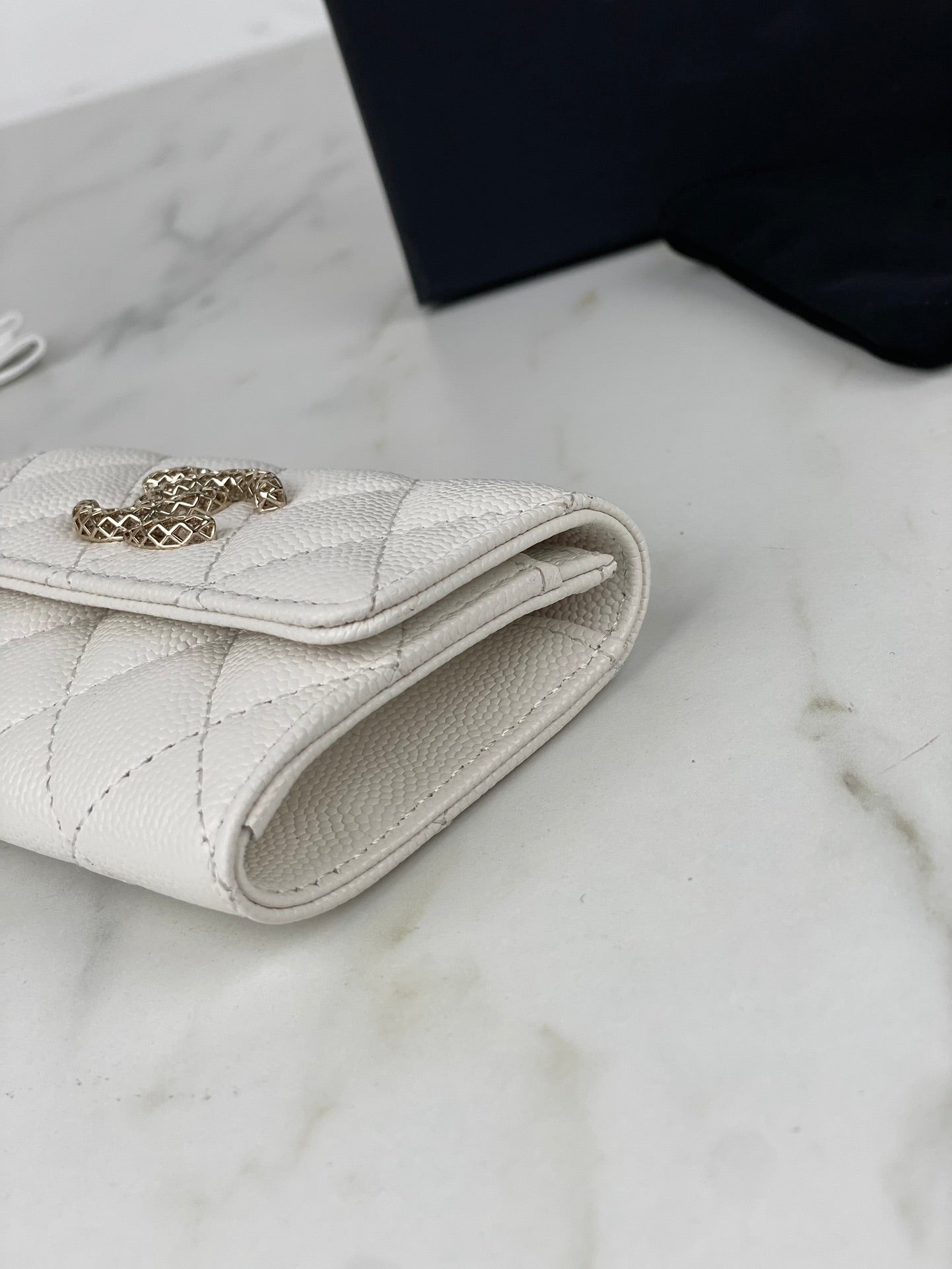 CC FLAP CARD HOLDER 11 WHITE GRAINED CALFSKIN GOLD ICON