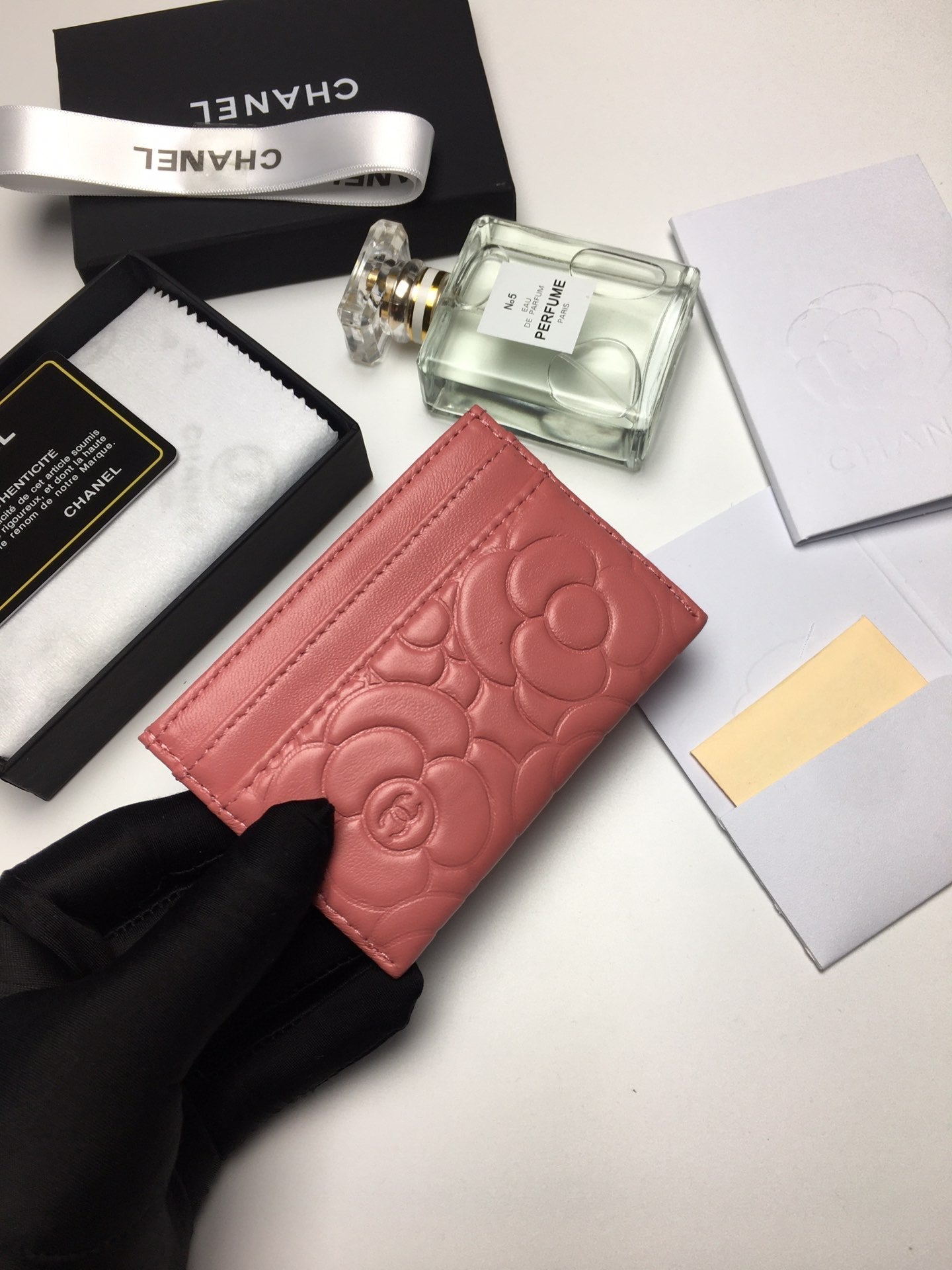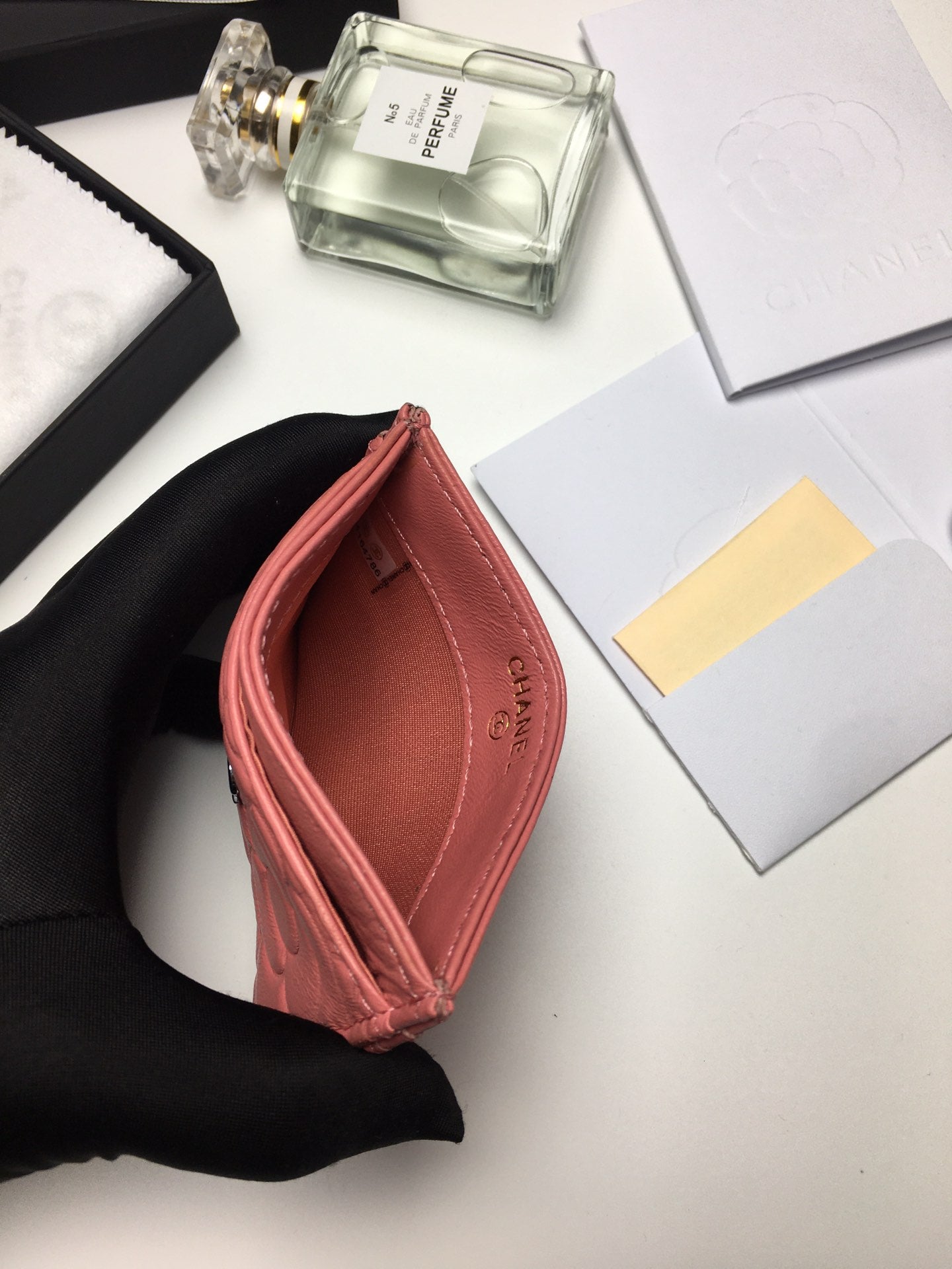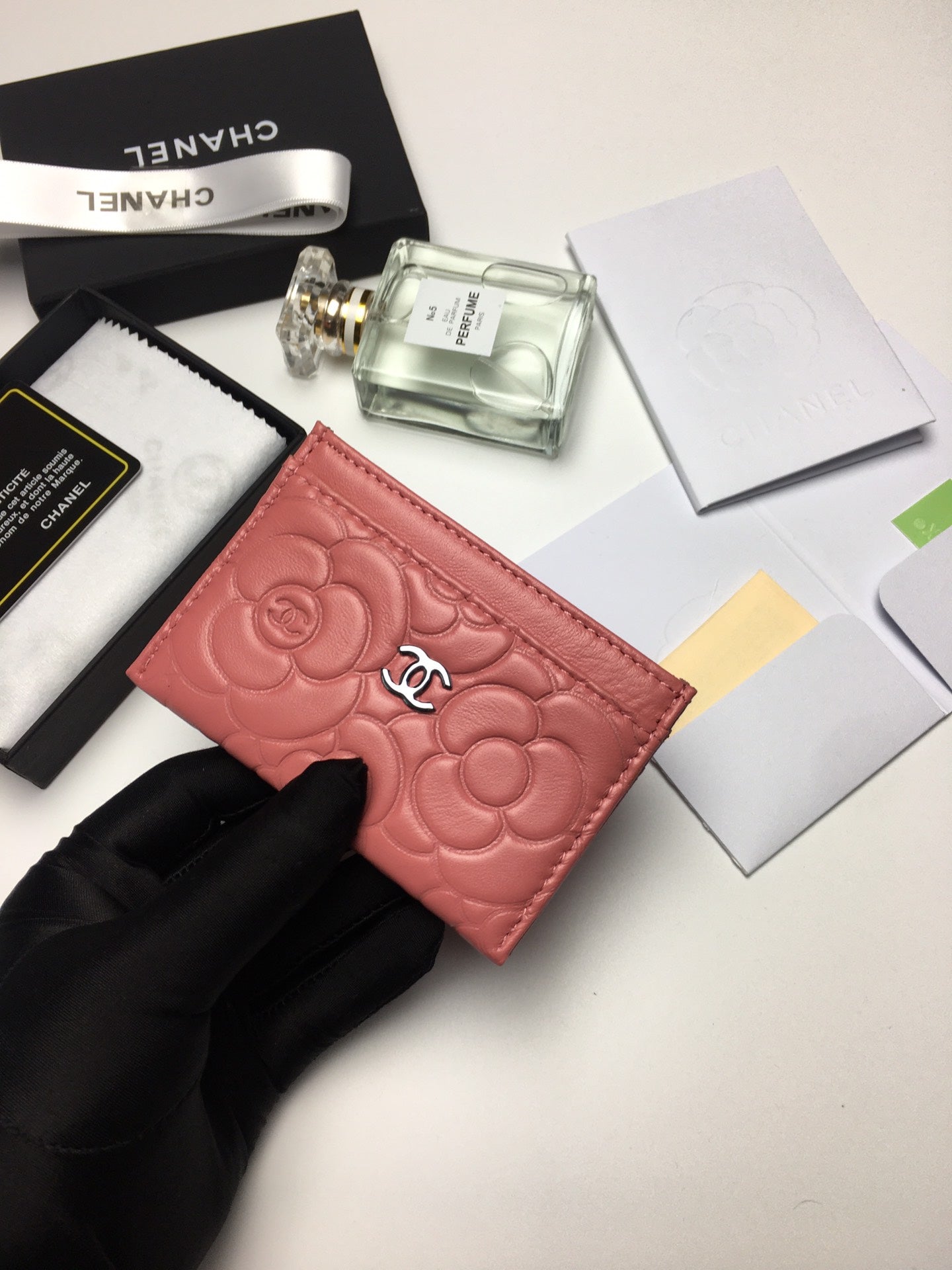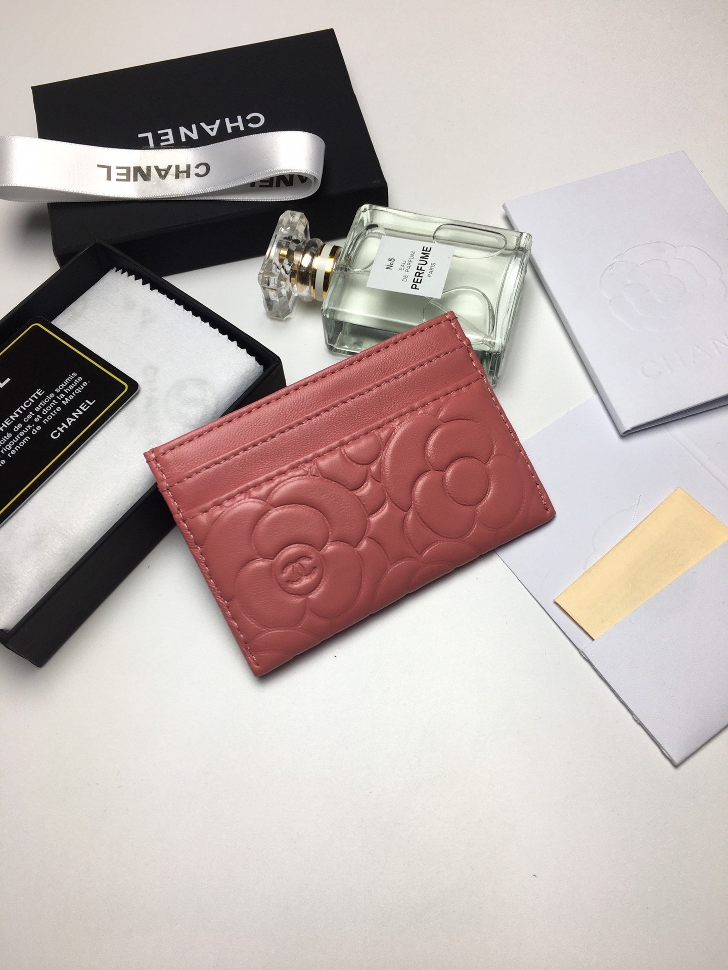 CC FLORAL CARD HOLDER 11.2 CORAL CALFSKIN SILVER ICON