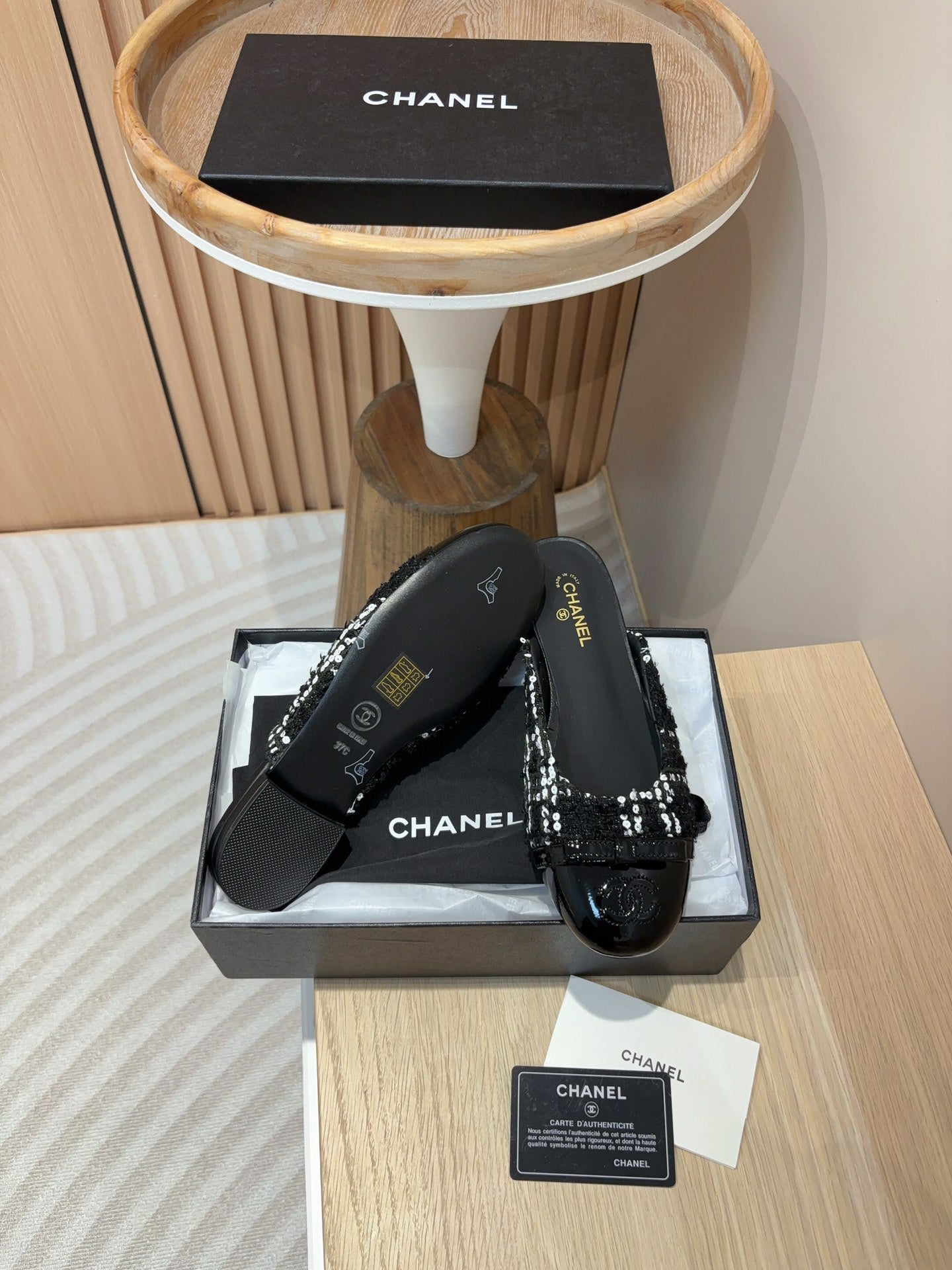 cc mule black tweed white sequin black patent calfskin