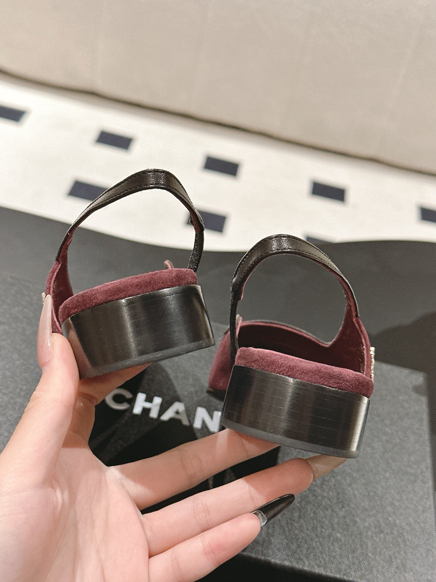 - Material: Suede with Patent Leather