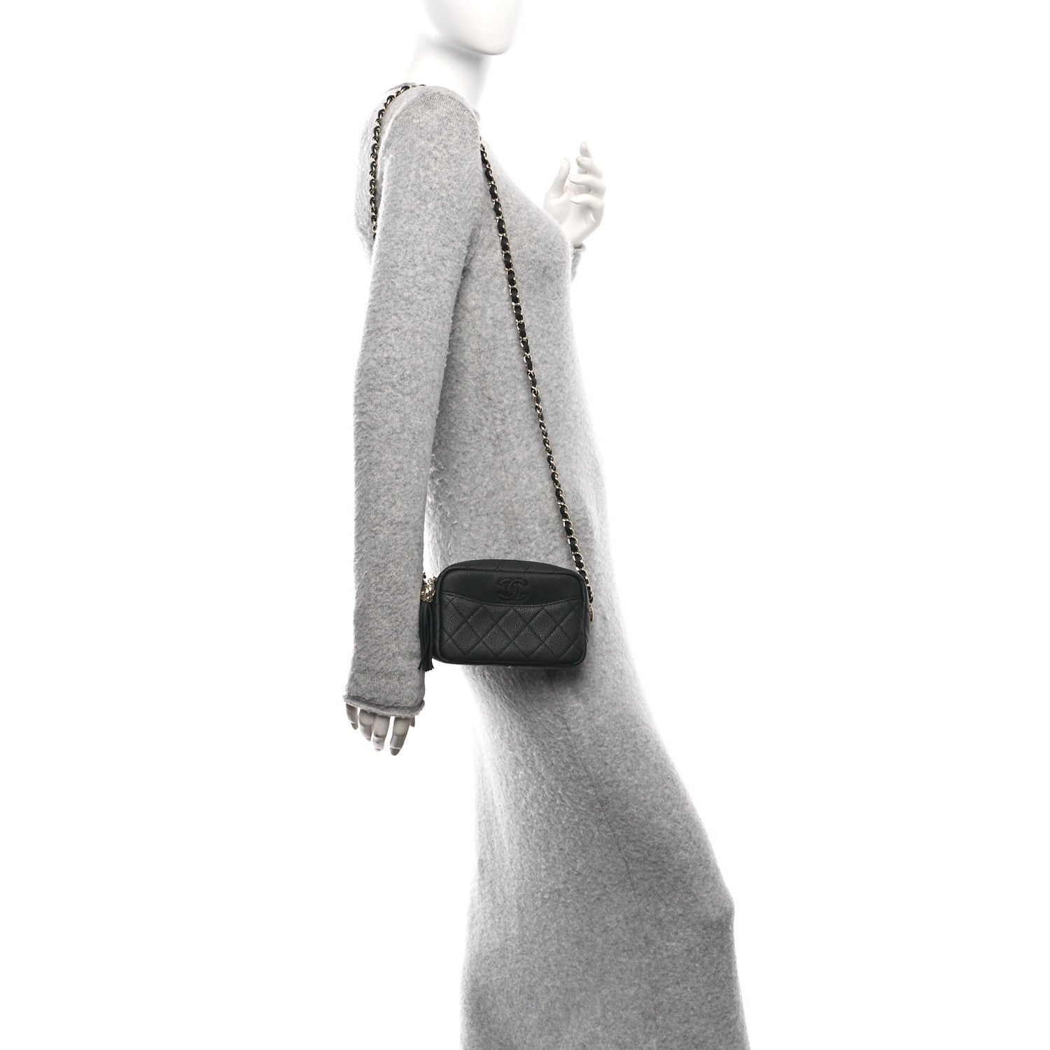 Iridescent Caviar Quilted Mini Coco Tassel Camera Case Black