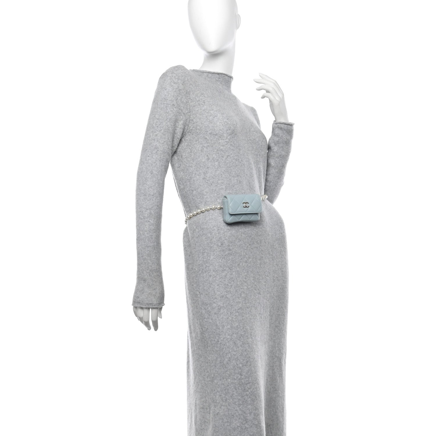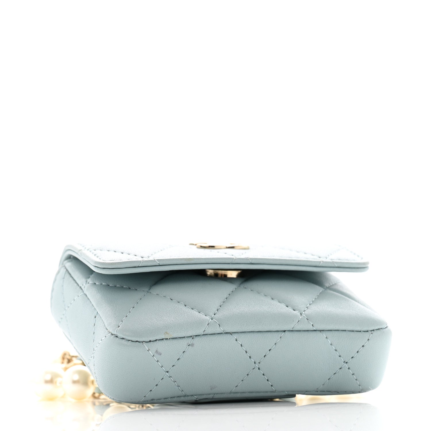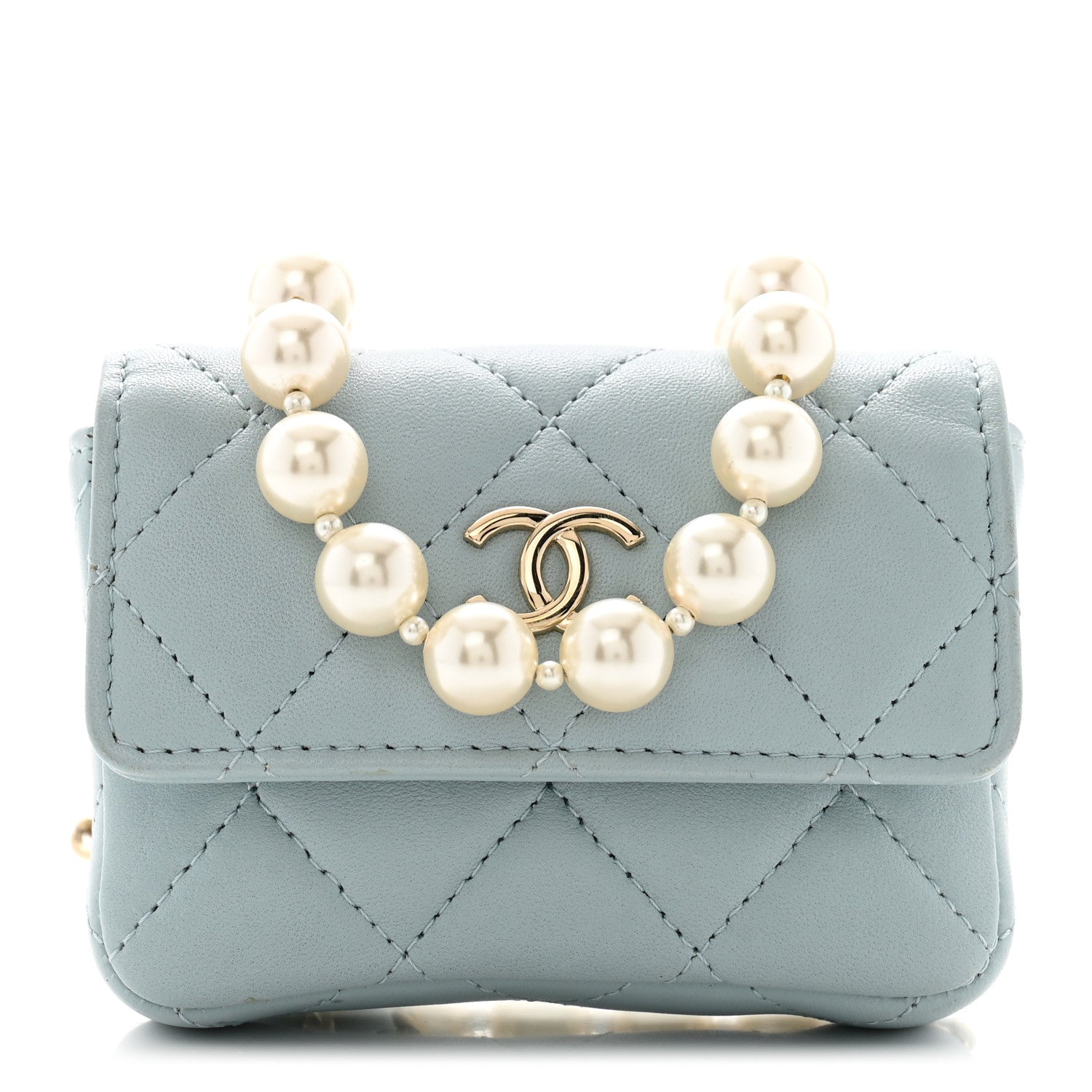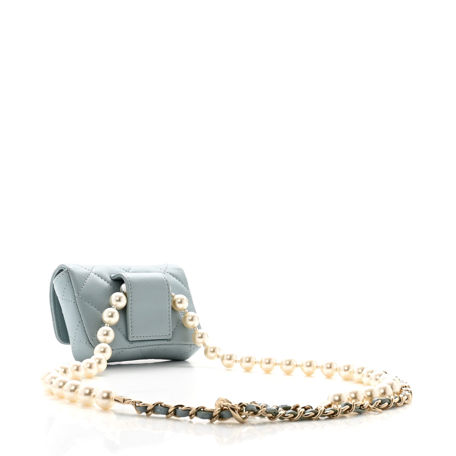 Expertly crafted with premium materials and designer-inspired detailing CHANEL Lambskin Quilted Pearl Chain Belt Bag in Light Blue. This stylish belt bag is finely crafted lambskin leather in light blue. It features a polished light gold chain link strap threaded with leather and accented with pearls. The flap has a frontal gold CC logo and opens with a snap button to a blue fabric interior.
