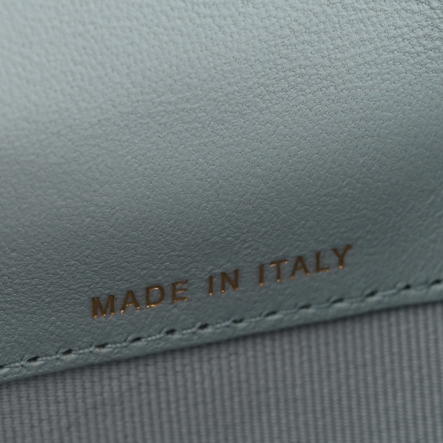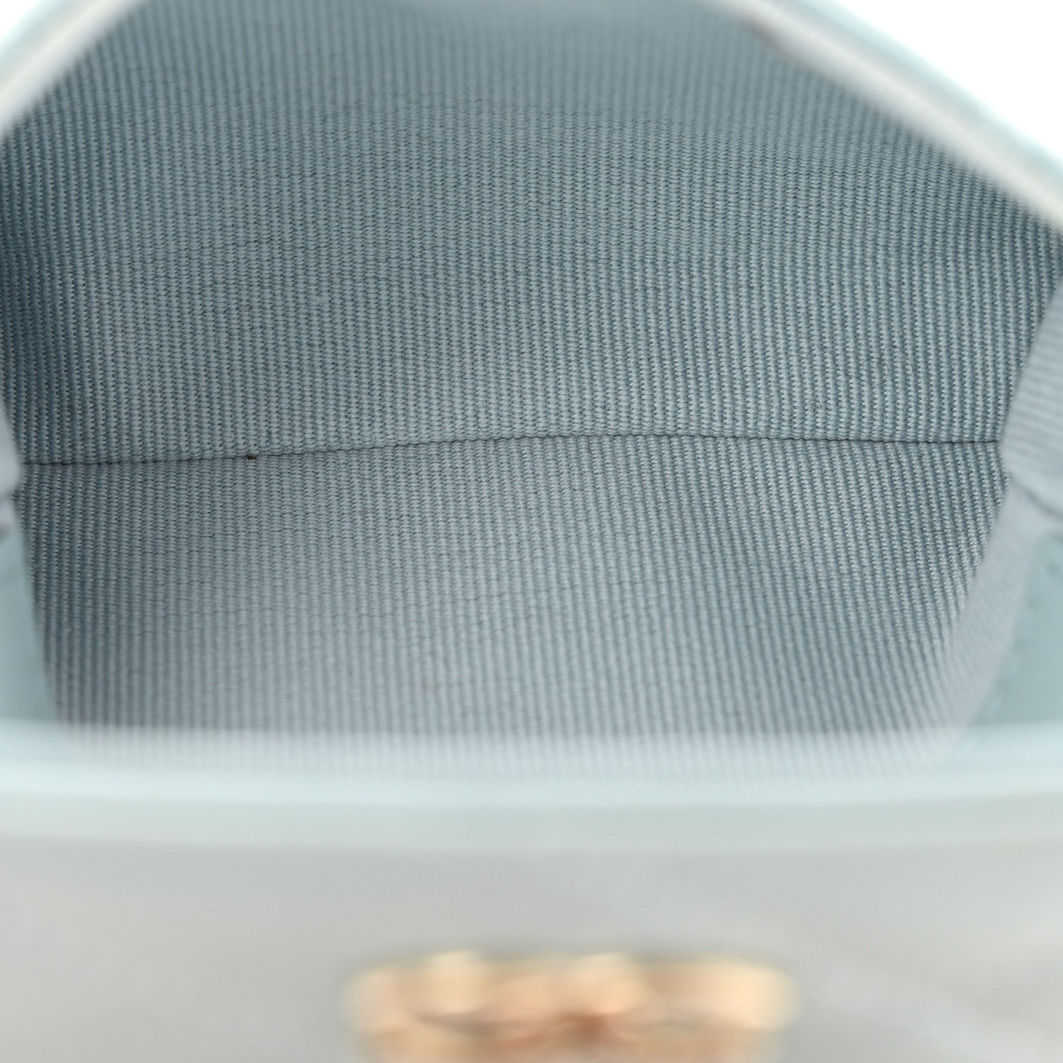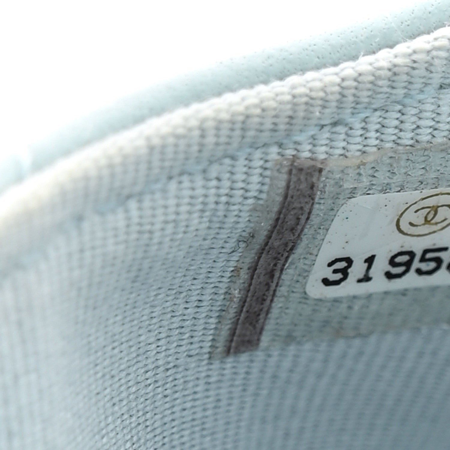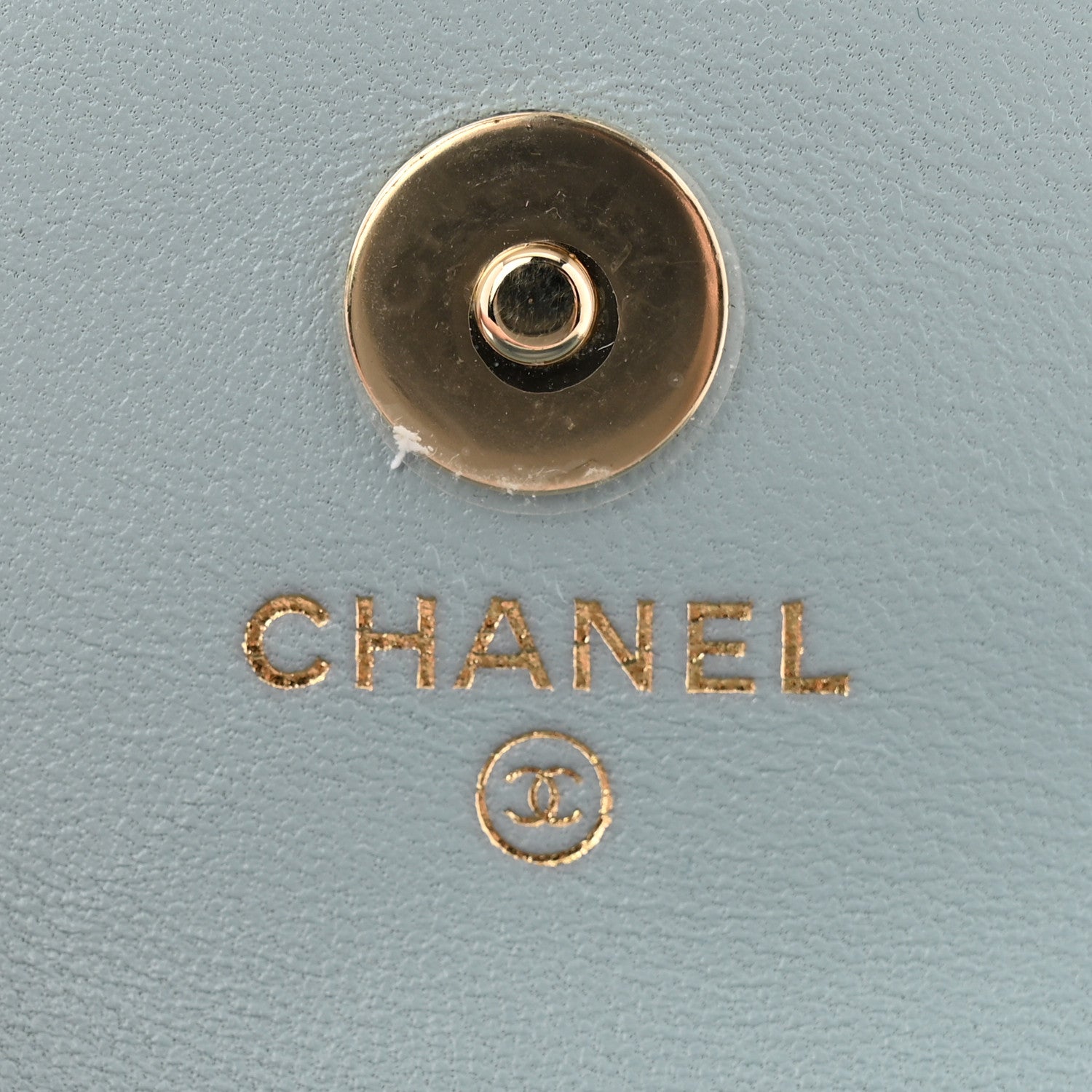 Expertly crafted with premium materials and designer-inspired detailing CHANEL Lambskin Quilted Pearl Chain Belt Bag in Light Blue. This stylish belt bag is finely crafted lambskin leather in light blue. It features a polished light gold chain link strap threaded with leather and accented with pearls. The flap has a frontal gold CC logo and opens with a snap button to a blue fabric interior.