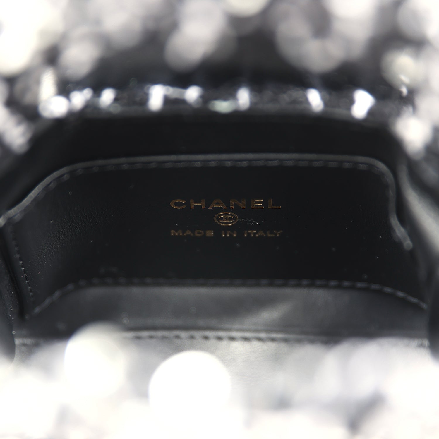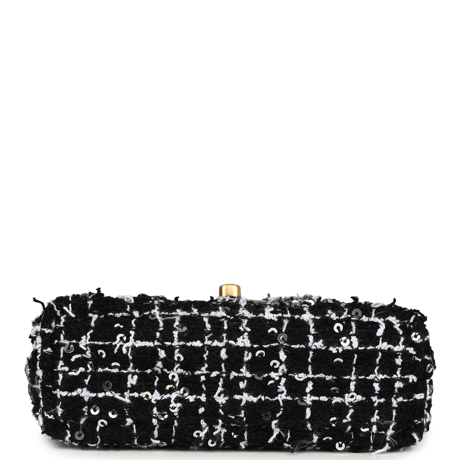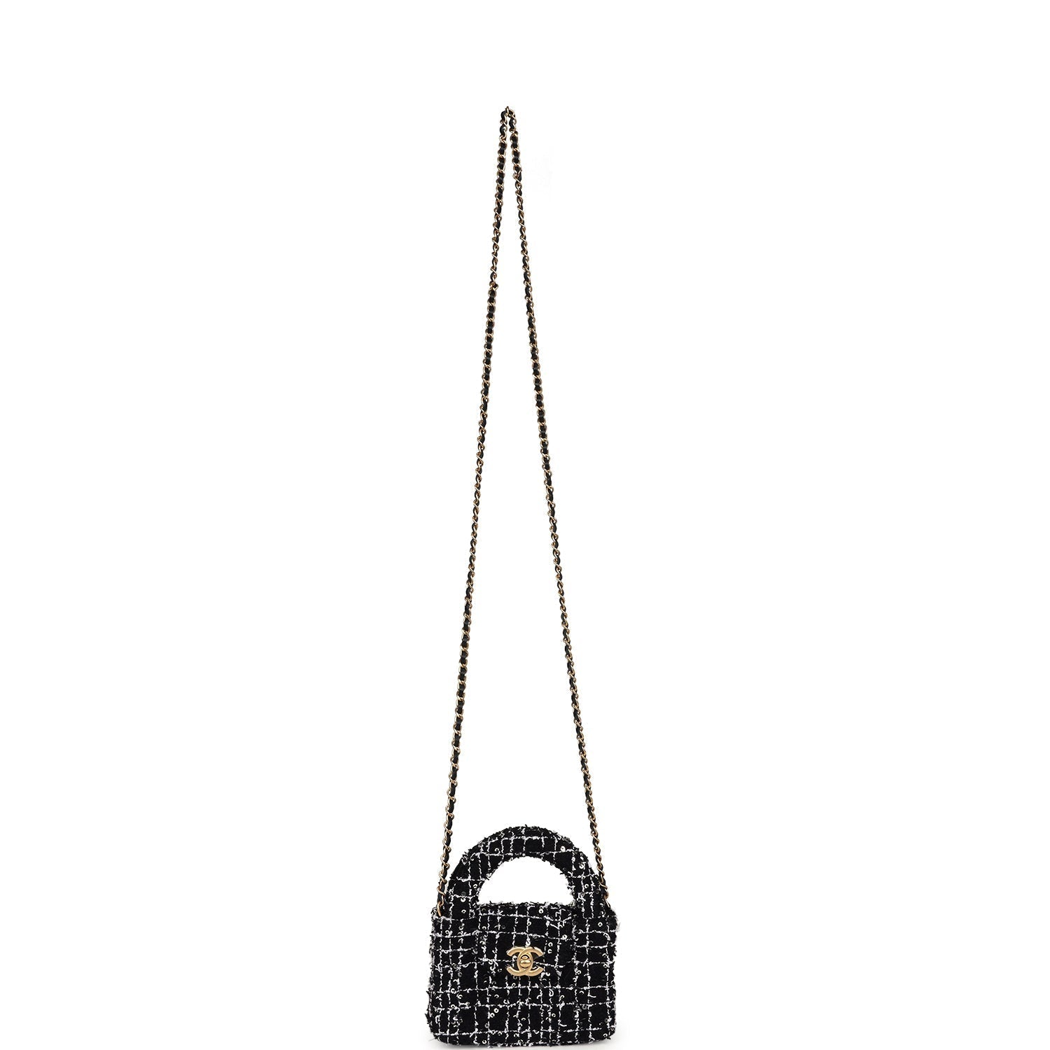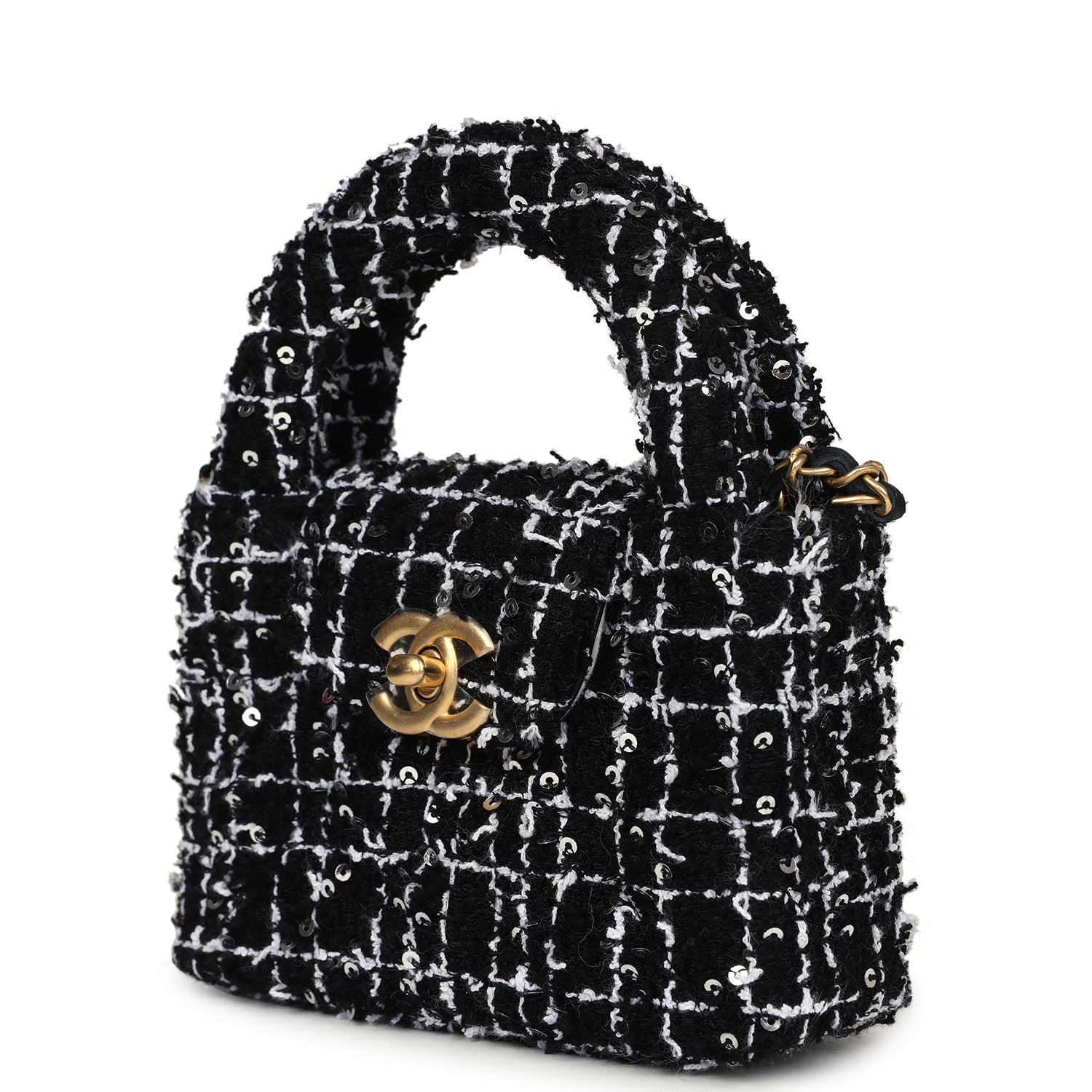 Chanel Nano Kelly Shopper Black, White & Silver Sequin Tweed Brushed Gold Hardware