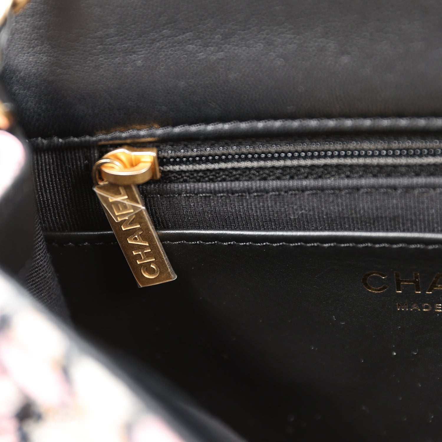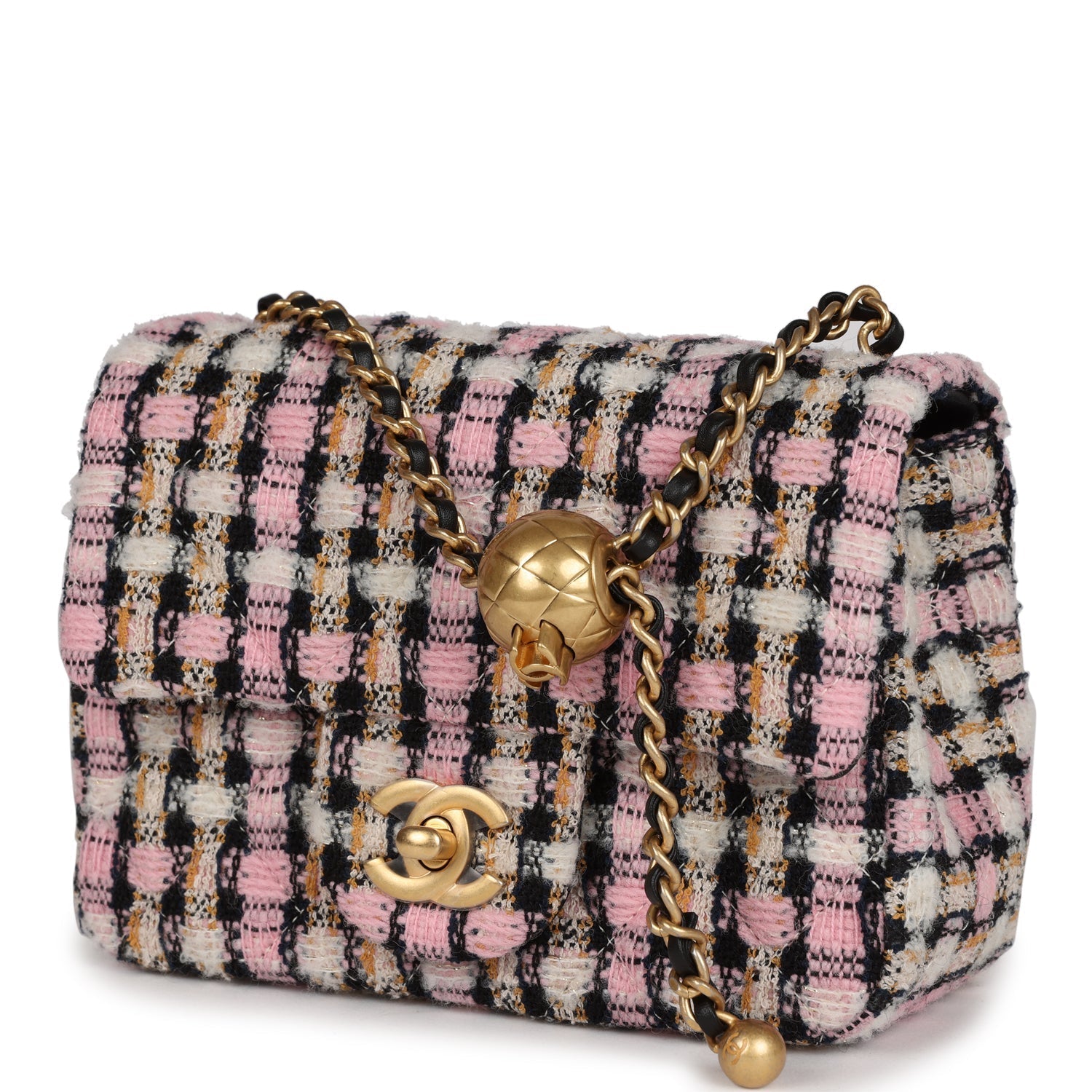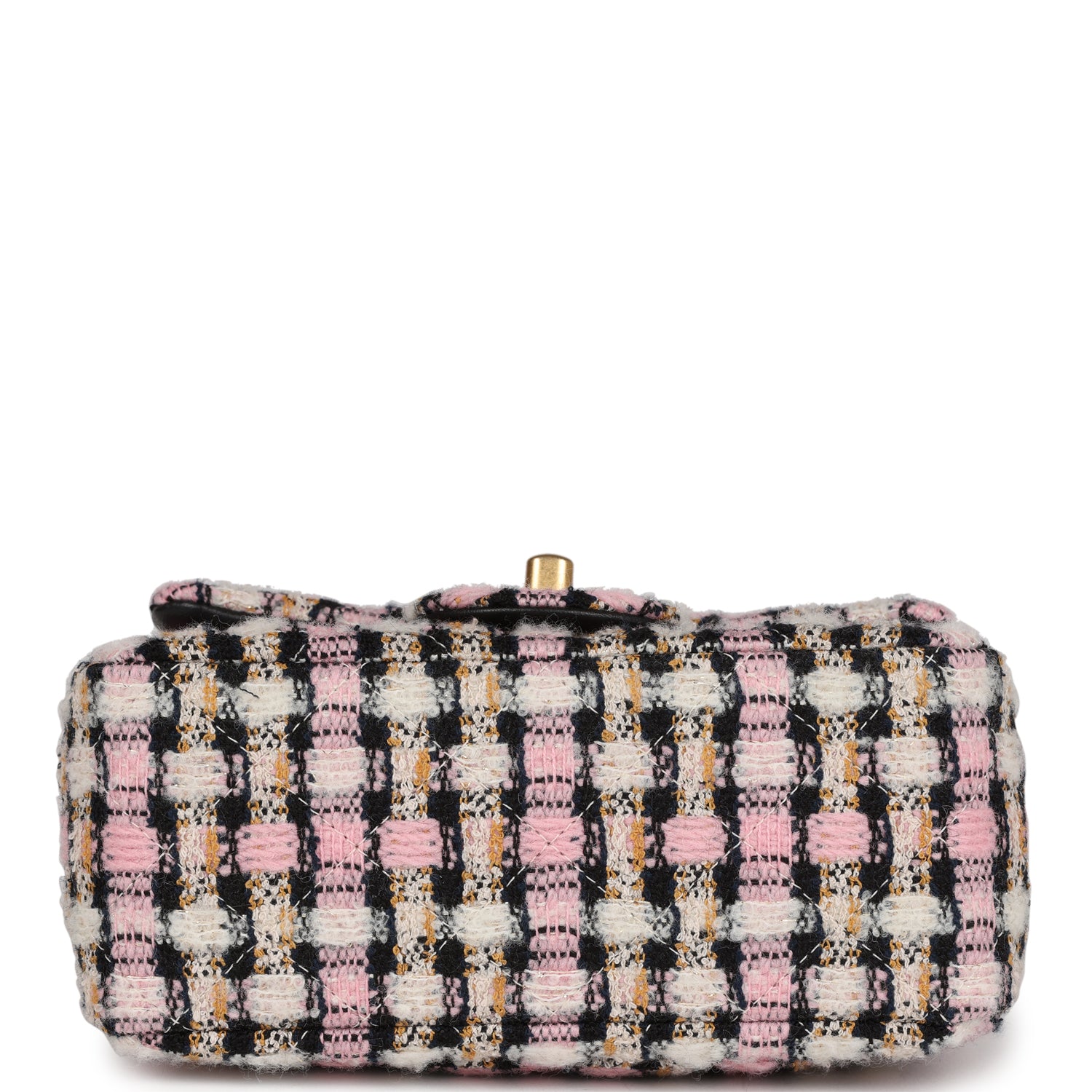 Chanel Pearl Crush Mini Square Flap Bag Pink and Black Tweed Antique Gold Hardware