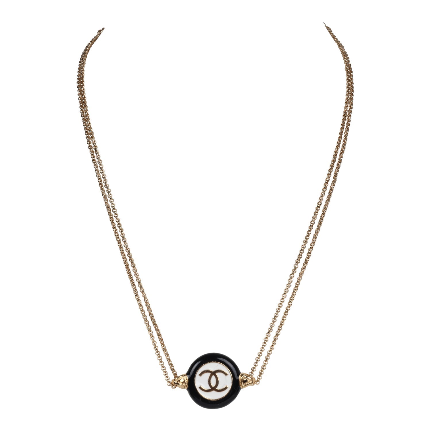 This Chanel round CC enamel pendant choker necklace with gold tone metal hardware features a small round black and white enamel and gold tone pendant and an adjustable doubled chainlink necklace and a lobster clasp closure.