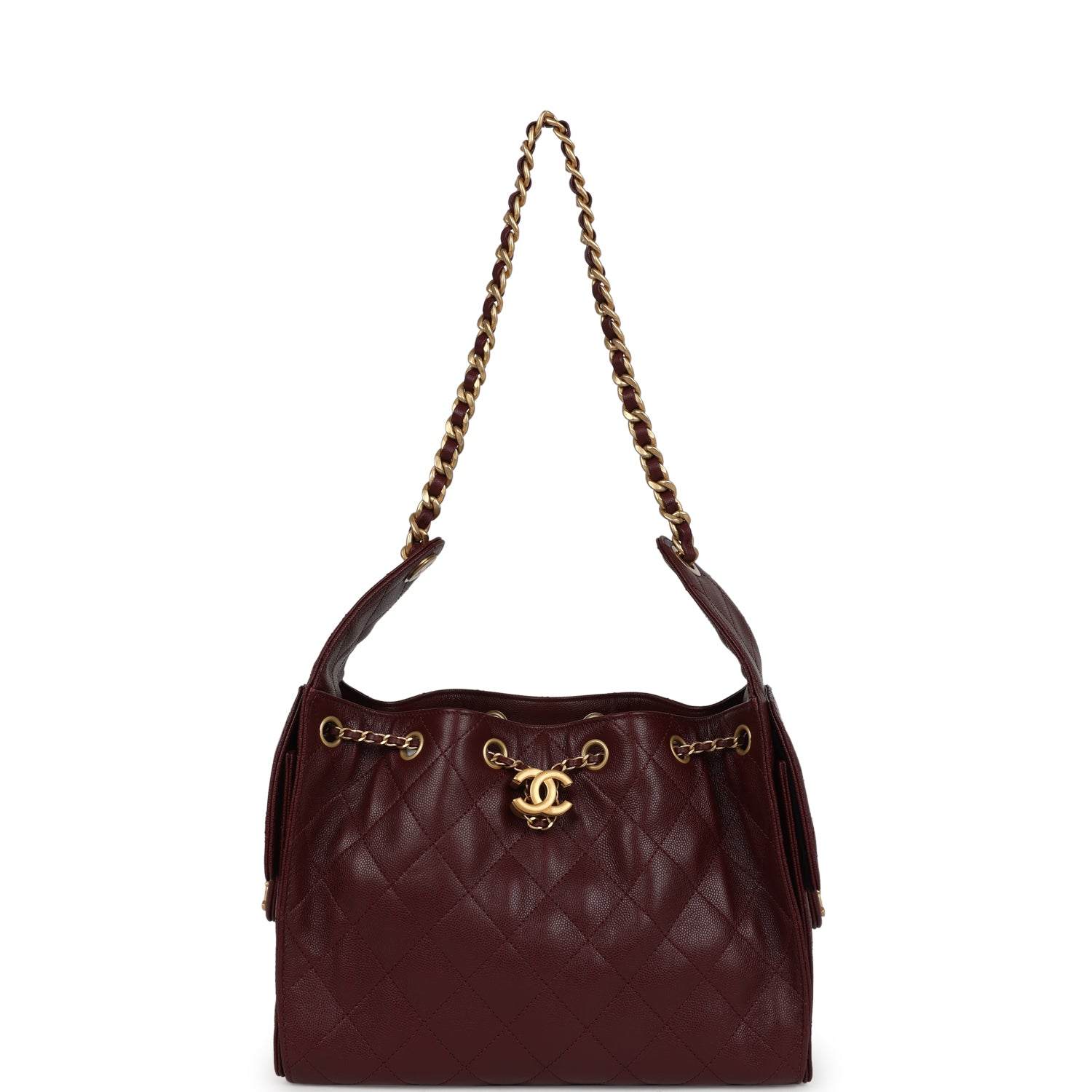 This Chanel Small 25 Hobo Bag is in burgundy caviar leather with antique gold hardware, features signature diamond quilt, two exterior side pockets, drawstring closure, and a single interwoven antique gold and burgundy leather shoulder strap.