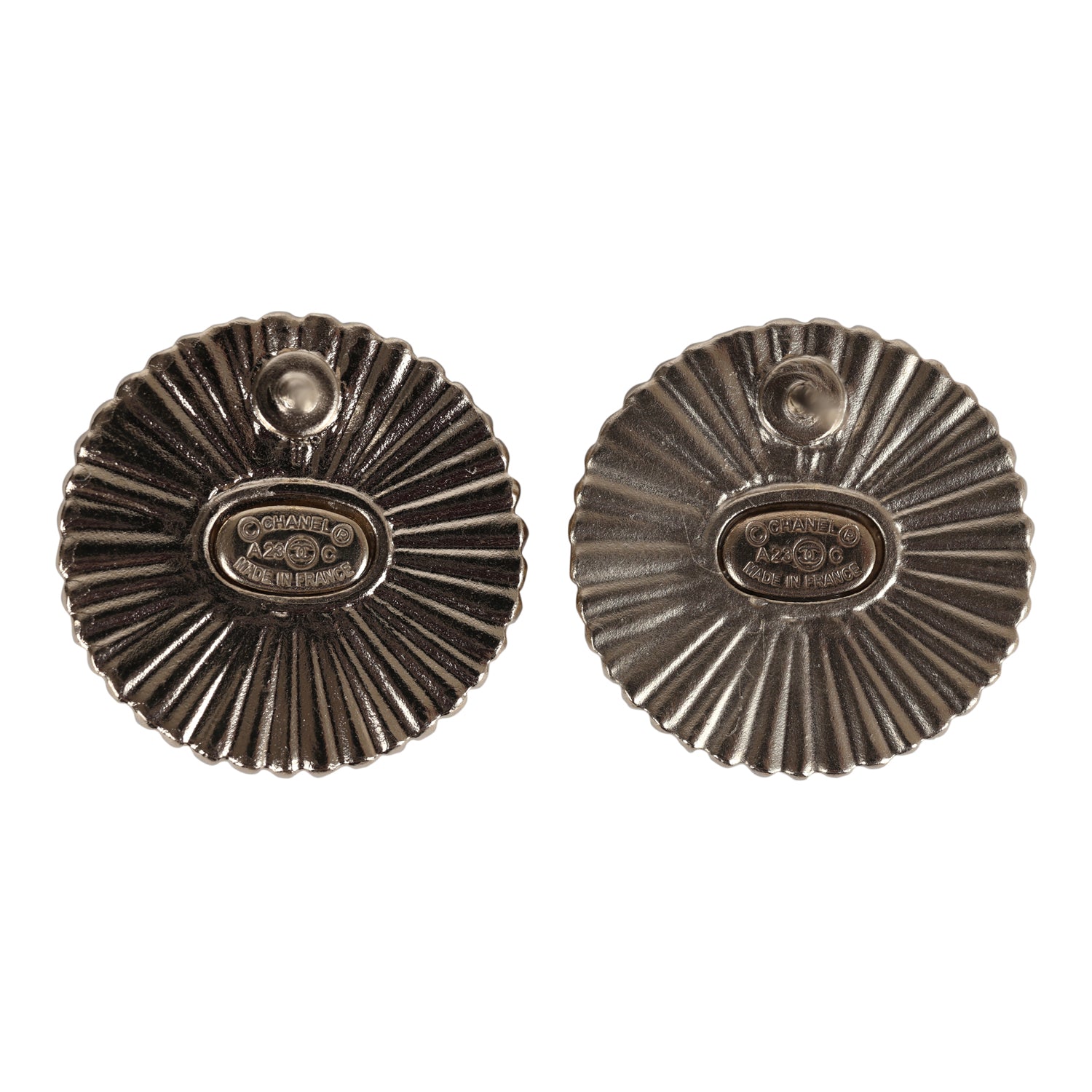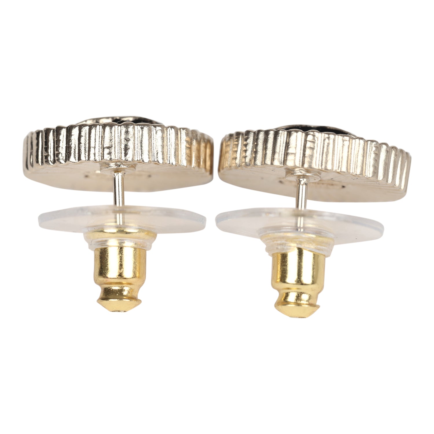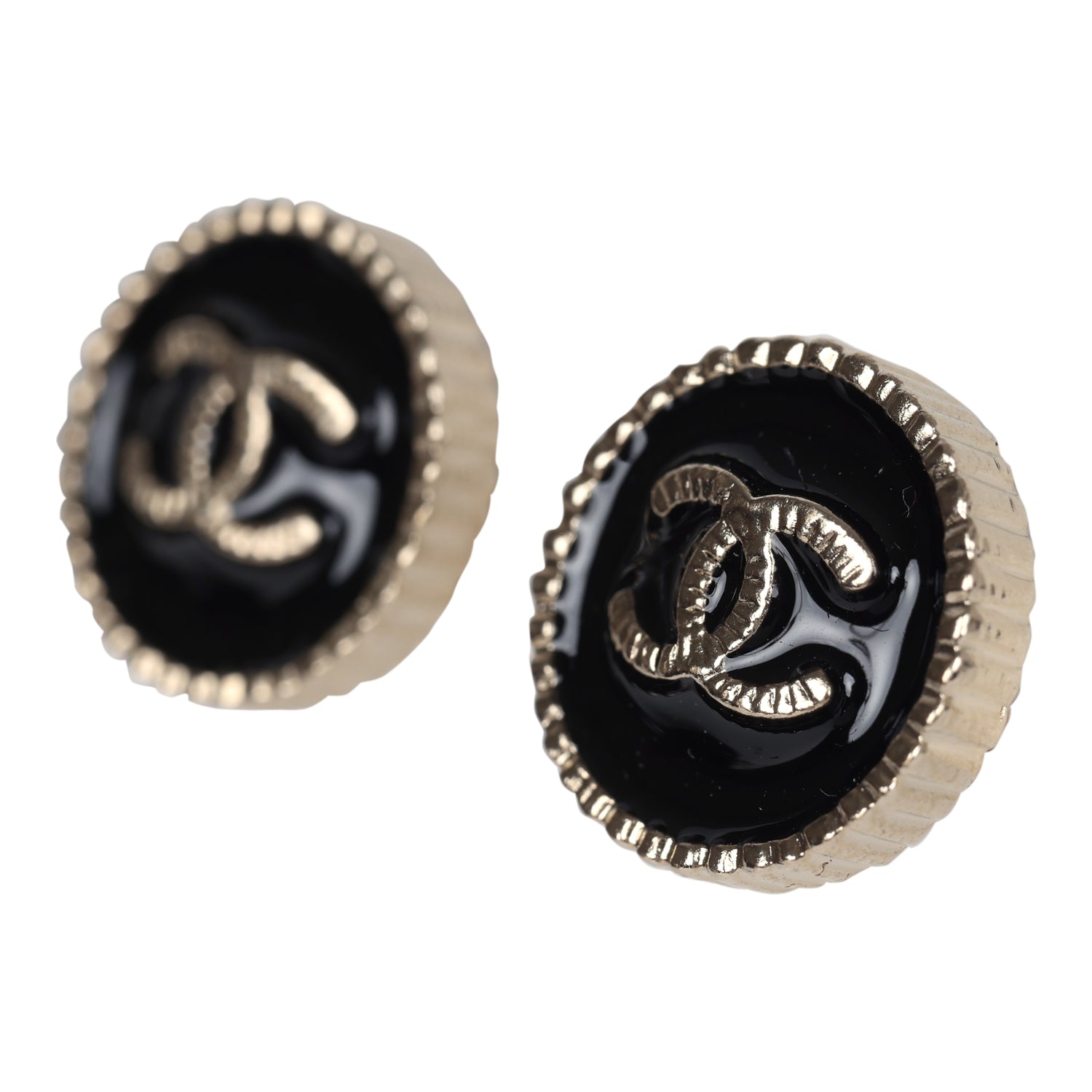 These Chanel small Round CC button earrings feature the signature CC logo in the center with black enamel and light gold tone hardware with post back closures.