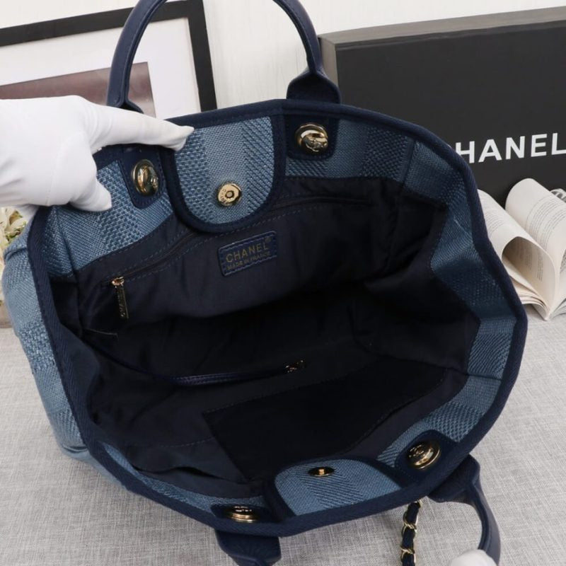CHANEL Woven Straw Raffia Striped Medium Deauville Tote