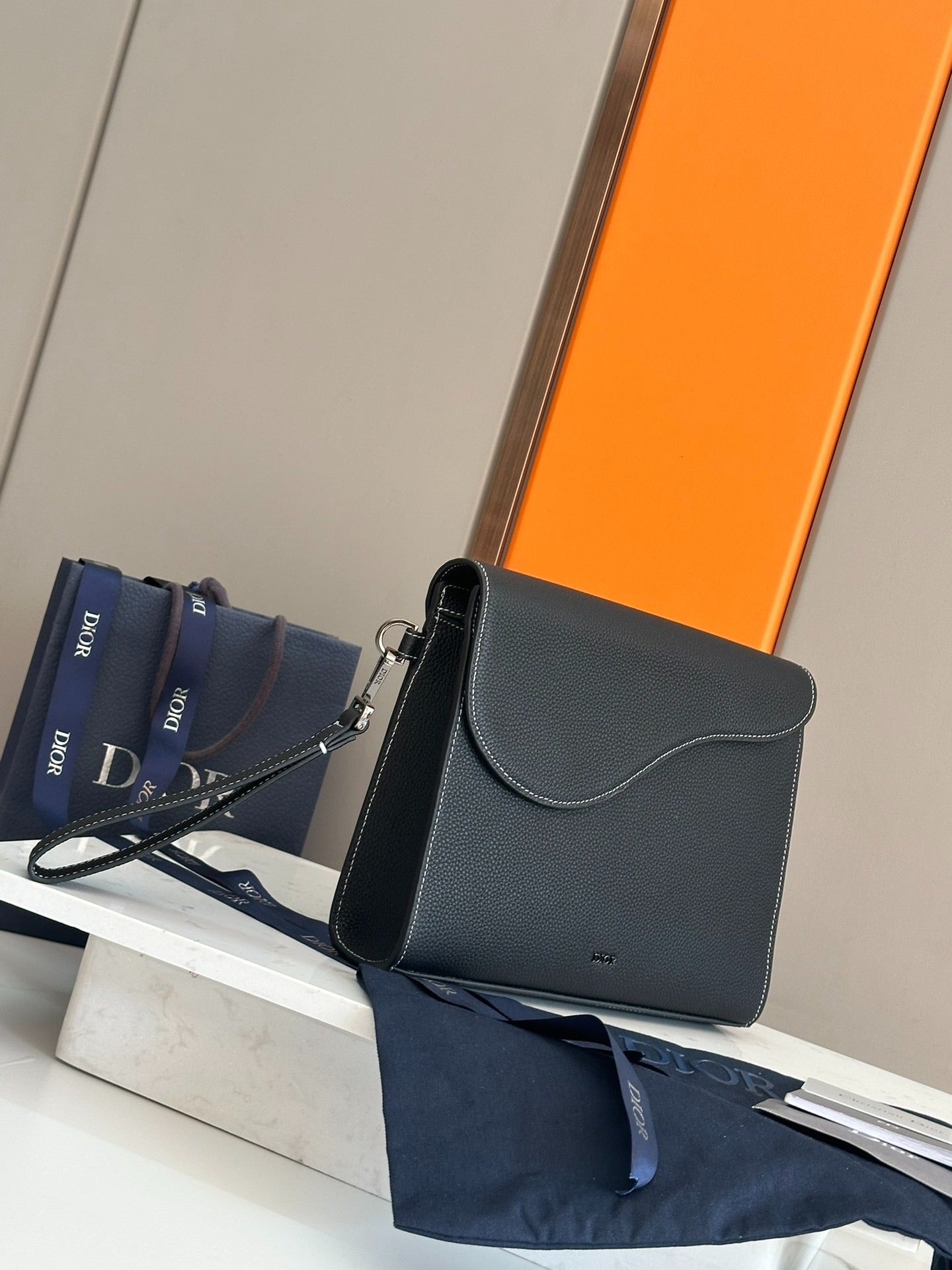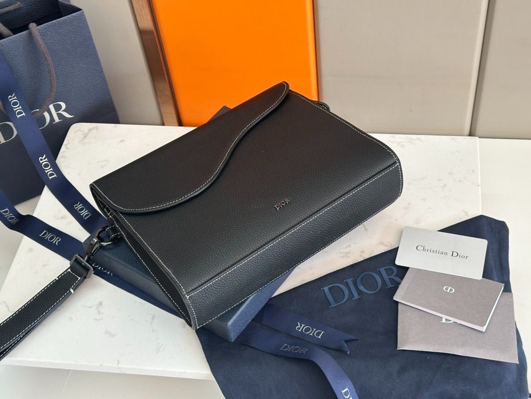 Christian Dior Style Flap Pouch | Black Grained Leather Contrasting Stitch
