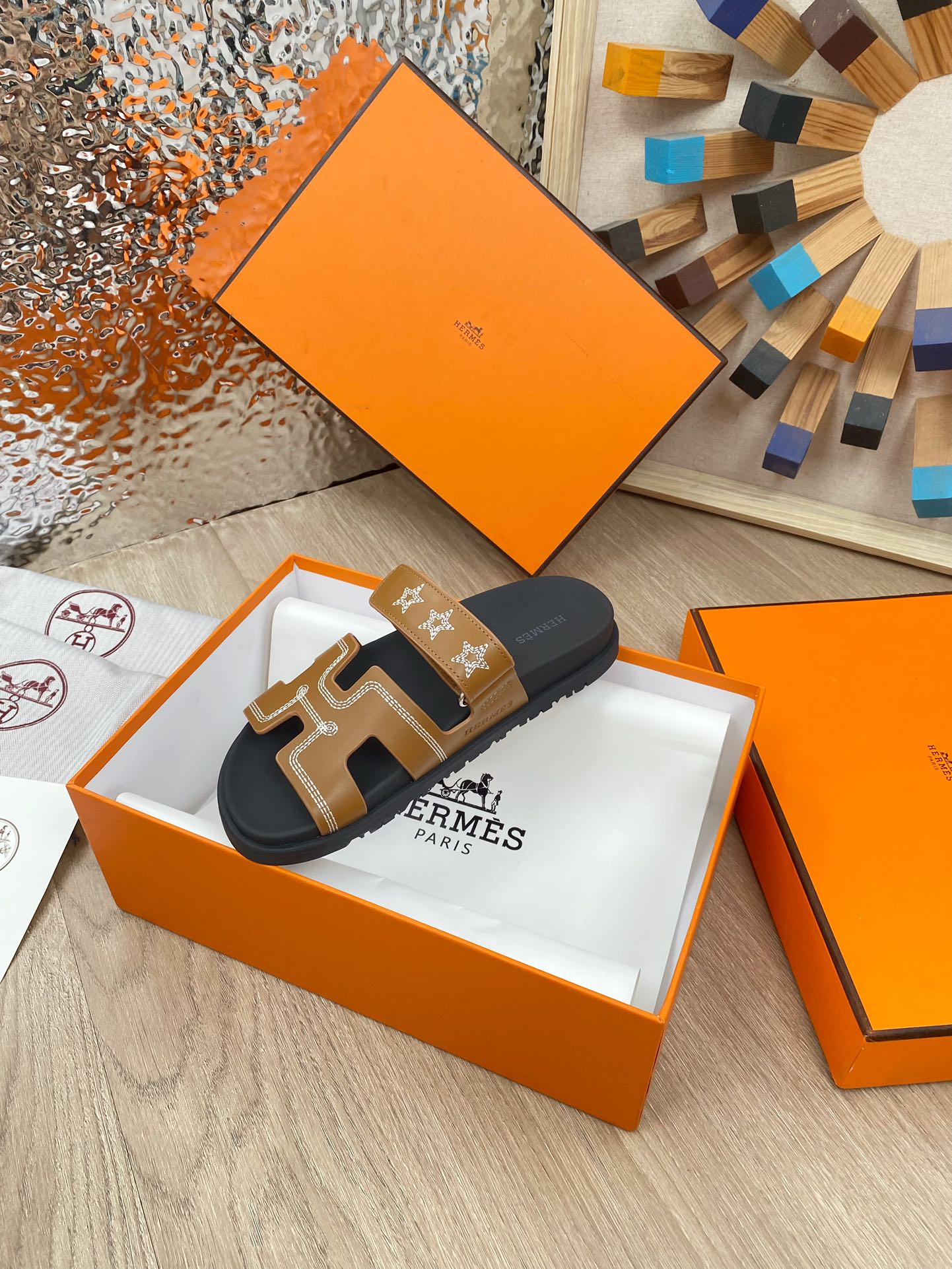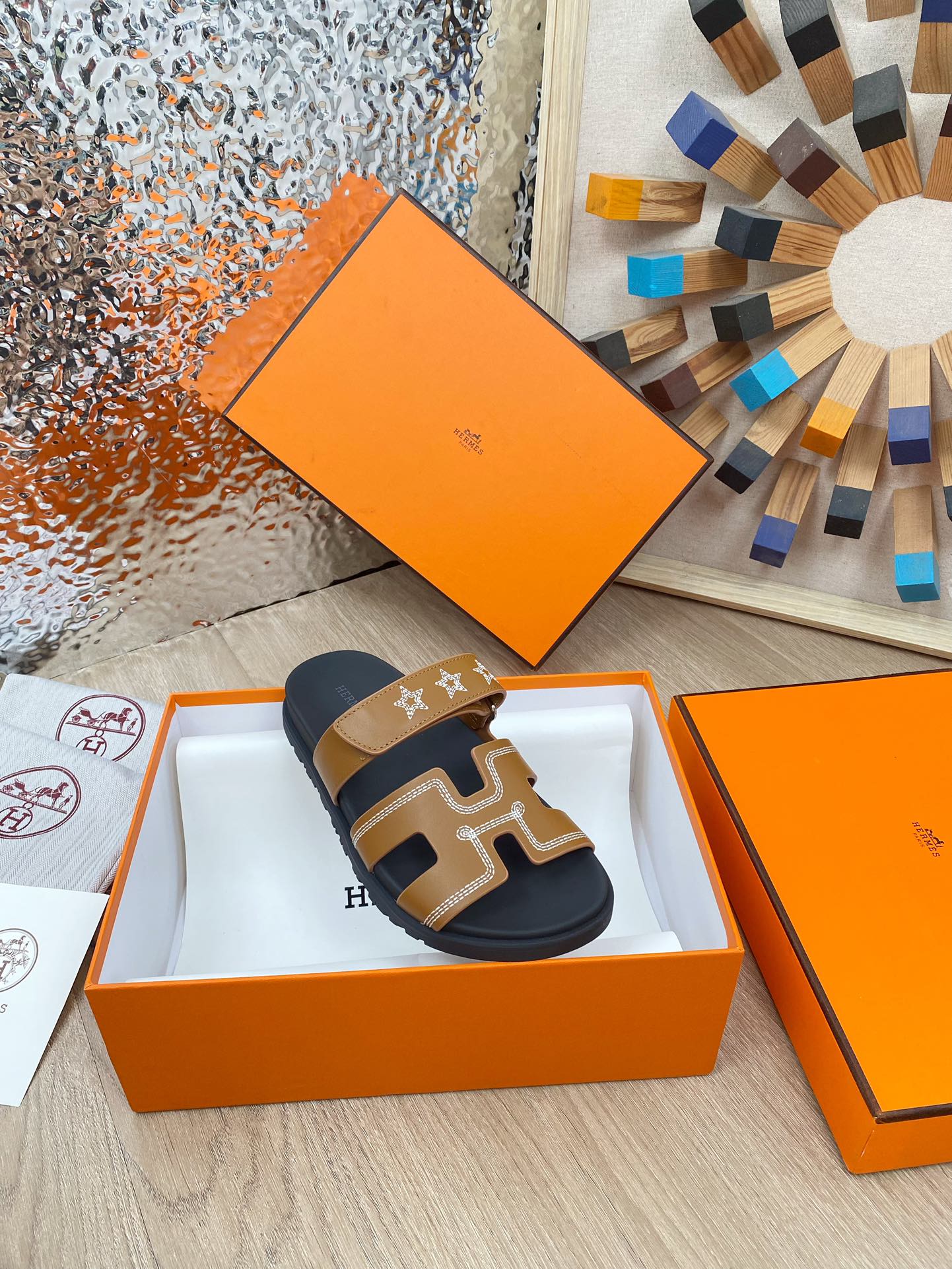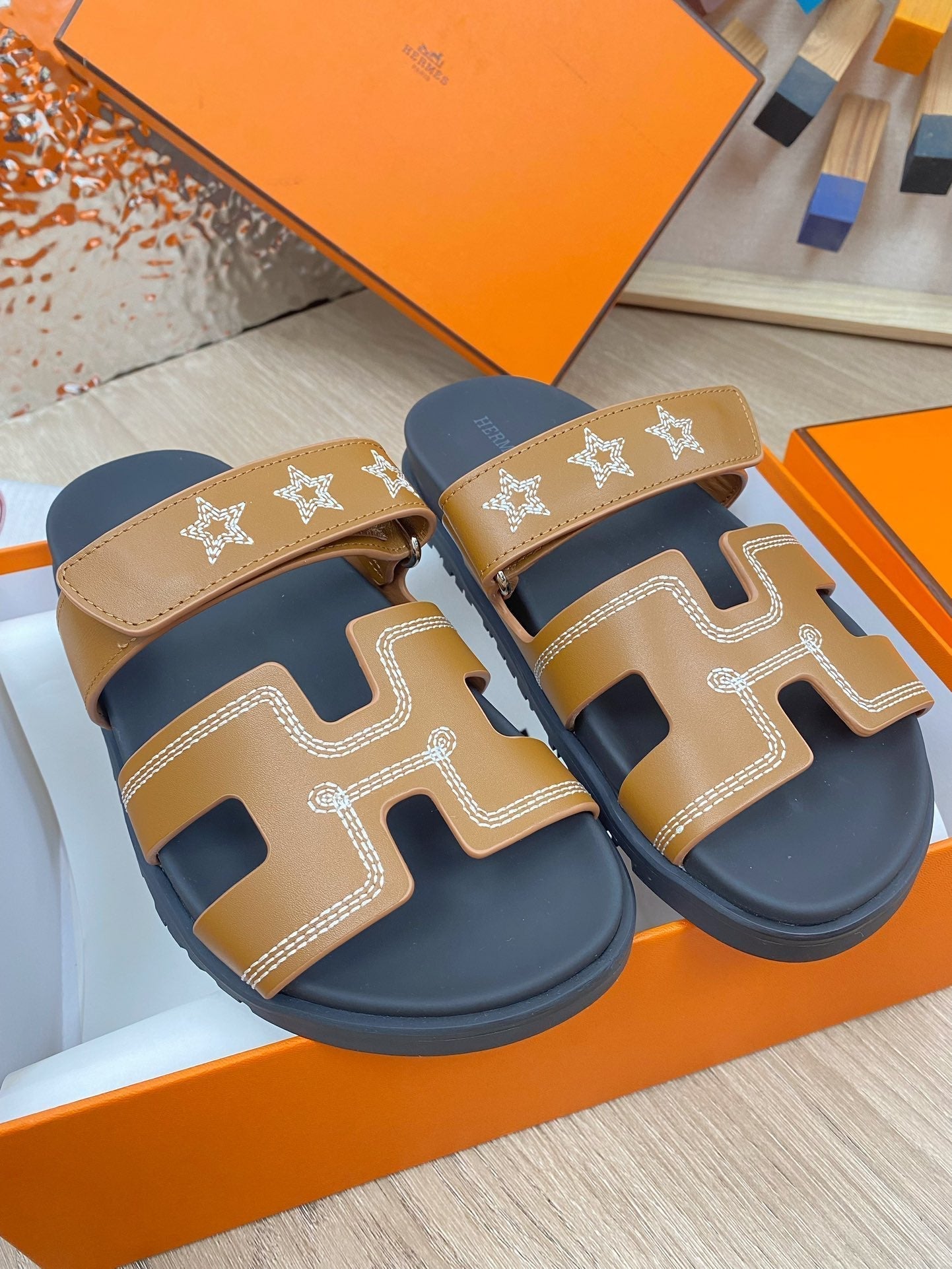 chypre sandal brown black calfskin white thread embroidered