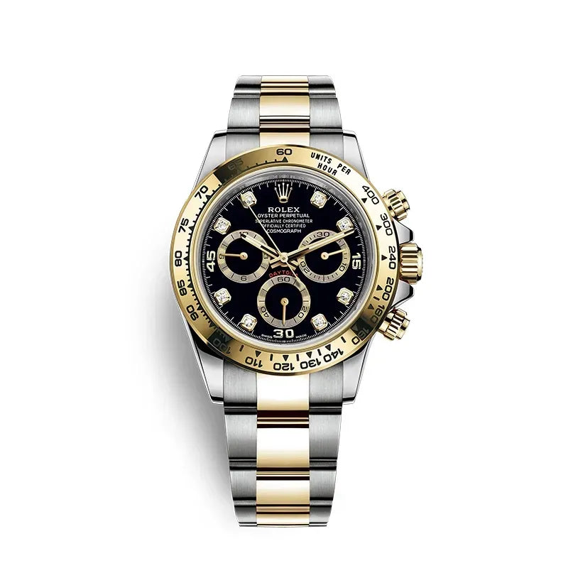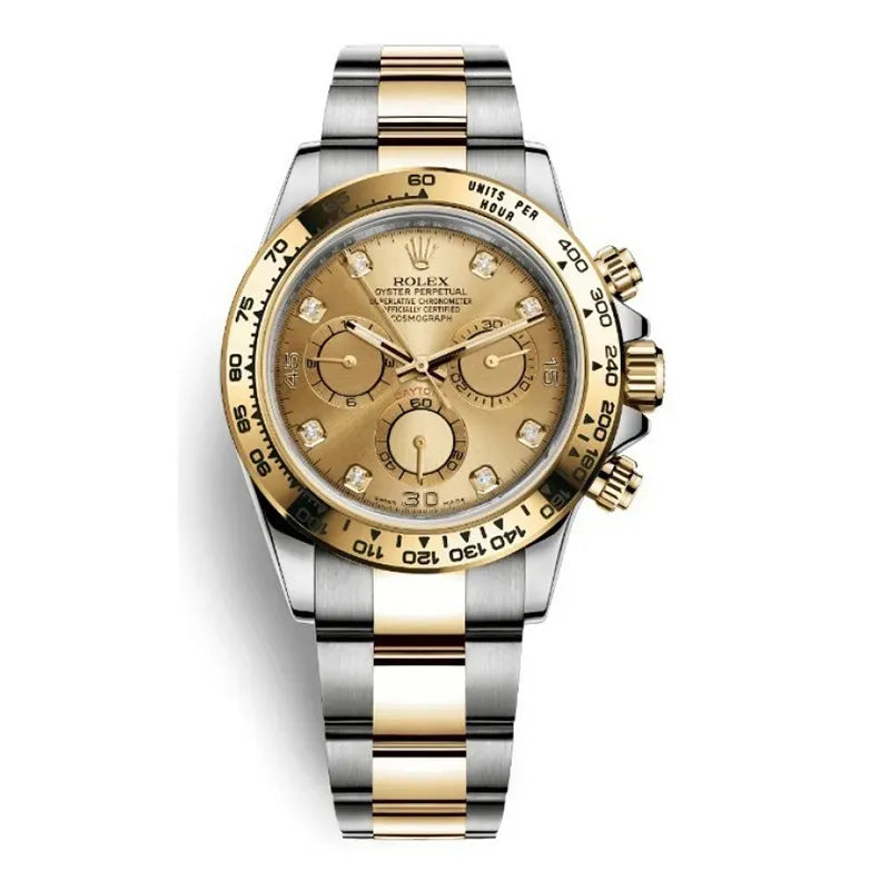 THIS OYSTER PERPETUAL COSMOGRAPH DAYTONA IN OYSTERSTEEL AND YELLOW GOLD, WITH A CHAMPAGNE-COLOUR DIAL AND AN OYSTER BRACELET, FEATURES A YELLOW GOLD BEZEL WITH ENGRAVED TACHYMETRIC SCALE.