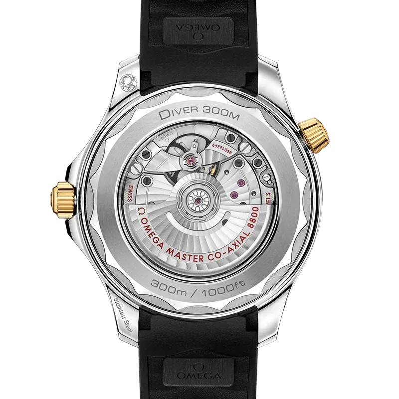 The watch is presented on a black rubber strap and is driven by the OMEGA Master Chronometer Calibre 8800, which can be seen through the sapphire-crystal on the wave-edged caseback.