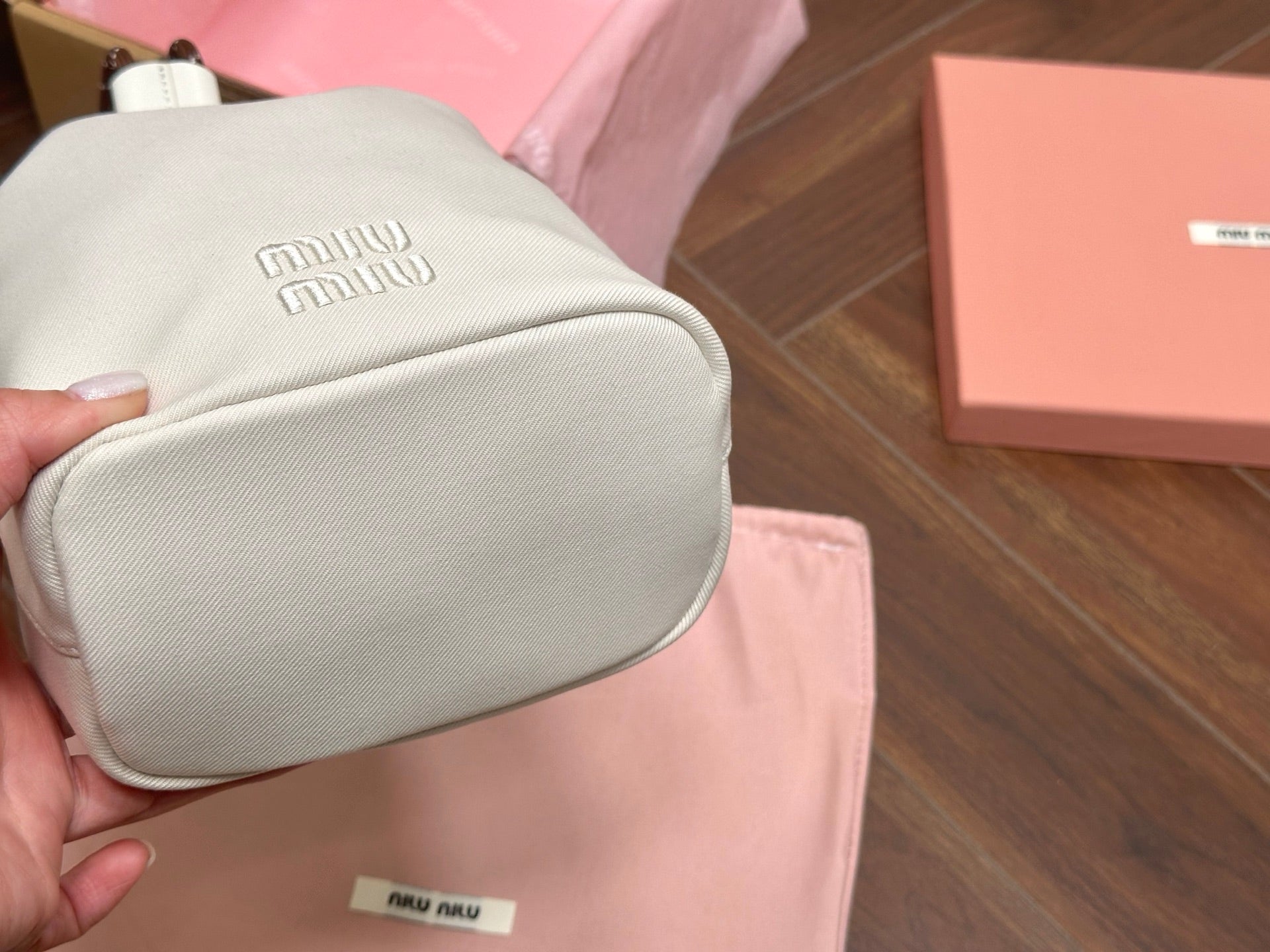 DRAWSTRING BUCKET BAG 21 IN WHITE CANVAS GOLD HARDWARE
