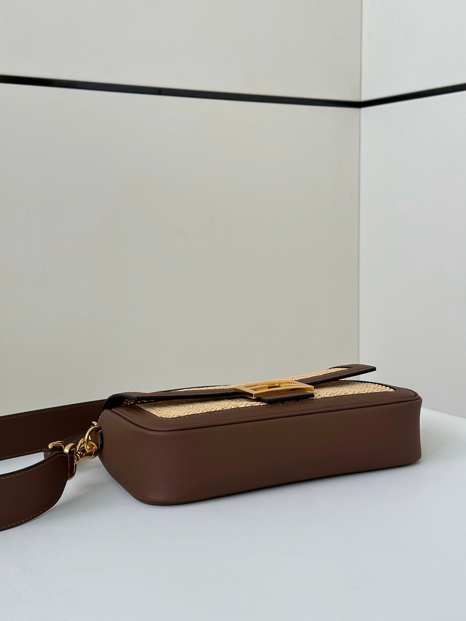FENDI BAGUETTE 27 BAG IN BEIGE RAFFIA AND BROWN CALFSKIN WITH GOLD HARDWARE
