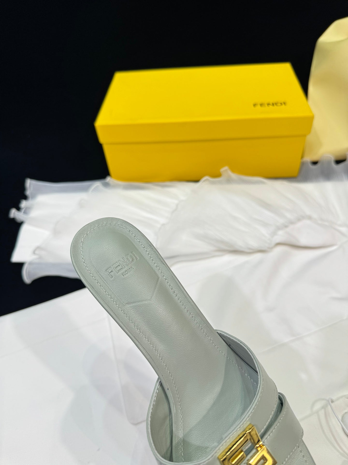 FENDI MEDIUM-HEELED 55 MM MULE IN ASH GREY LAMBSKIN WITH GOLD HARDWARE