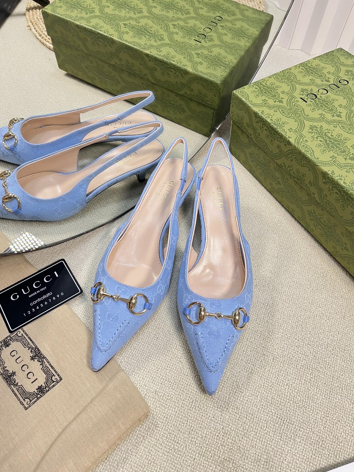 GC Horsebit Slingback Pump 50mm Blue Canvas Sheepskin 294546