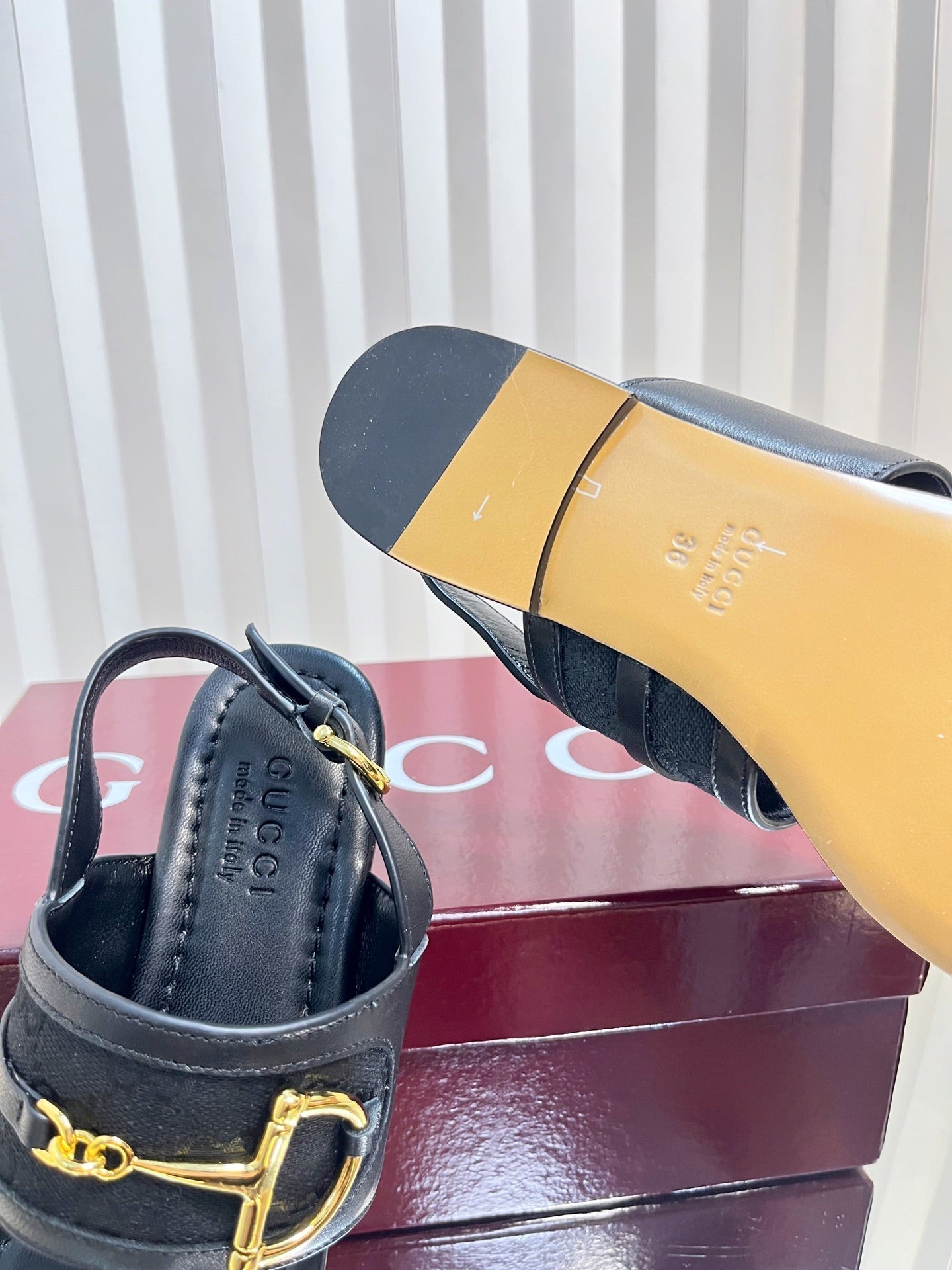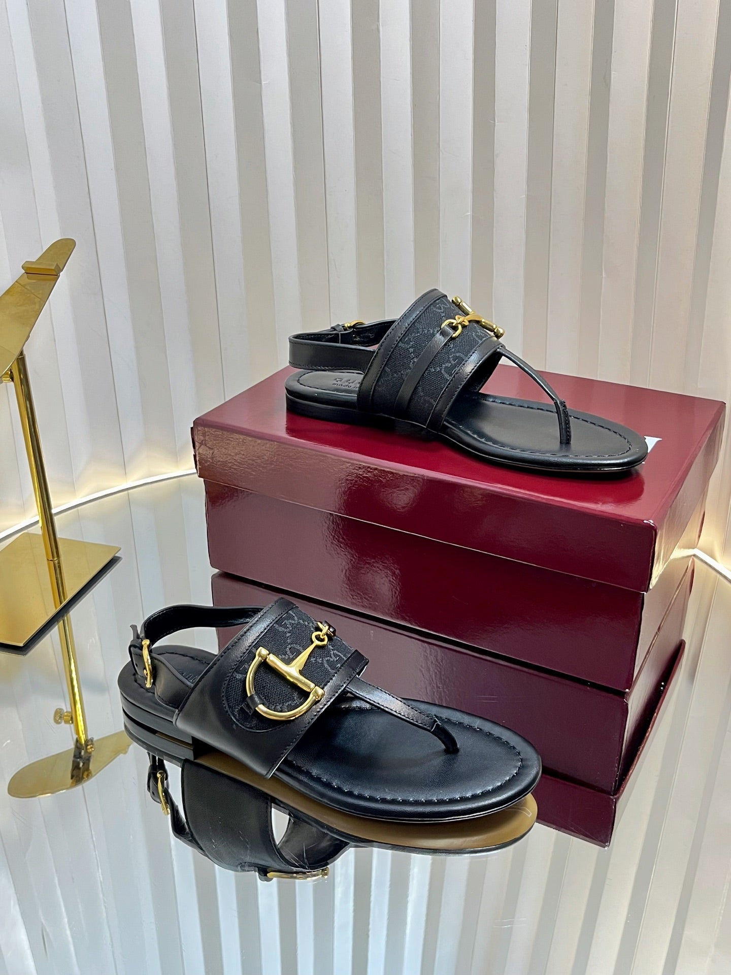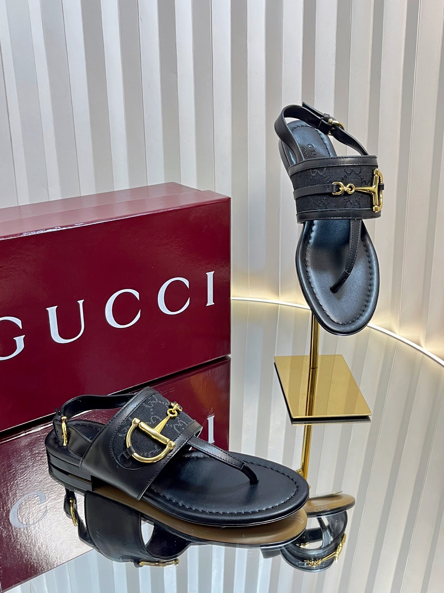 GC Horsebit Thong Sandals Black Canvas Sheepskin 294539