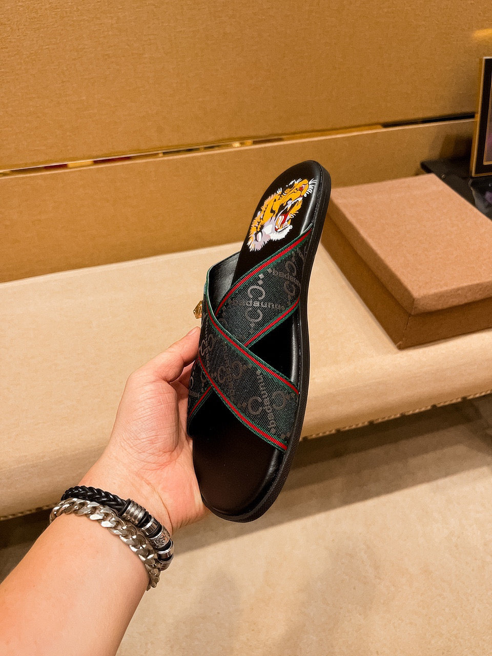 GG Men's Sandals Slide Green Black Leather