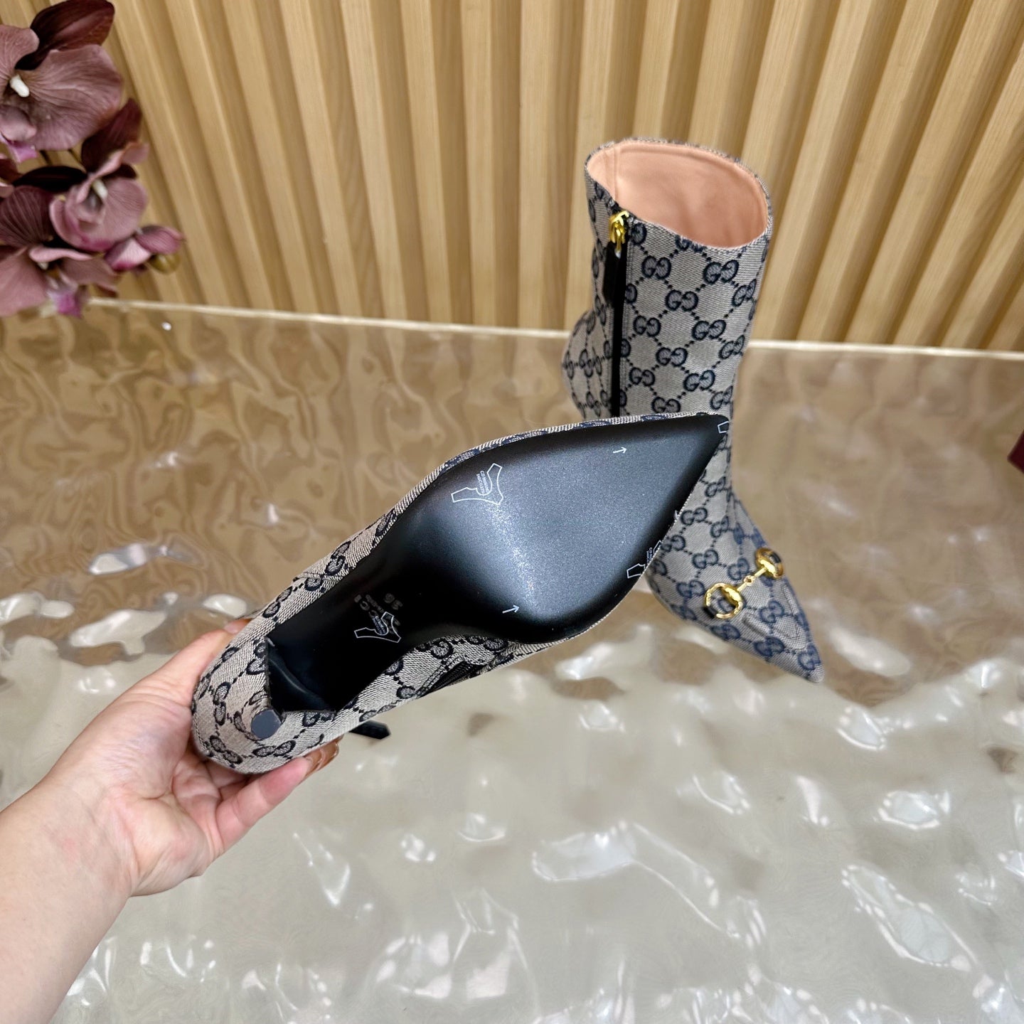 Gucci 2025 Thick-heeled Square-toed Ankle Boots Blue Sheepskin Fabric 498065
