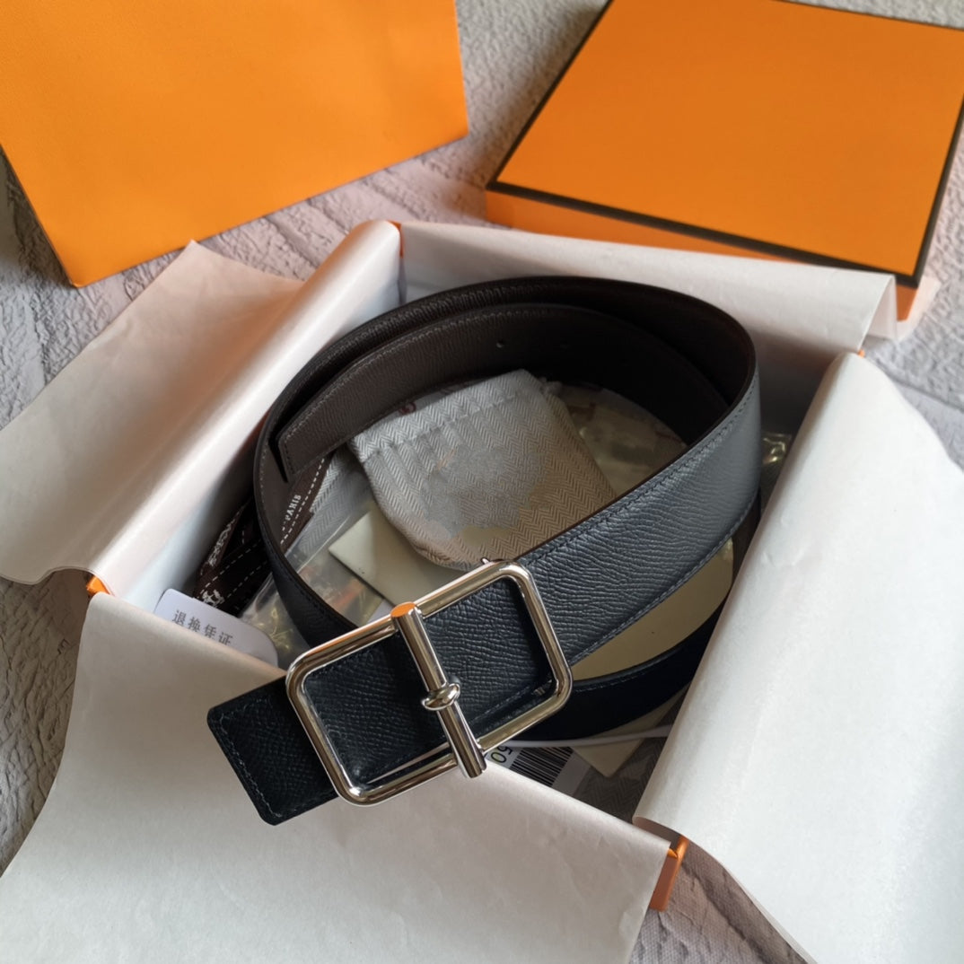 H BELT SILVER BUCKLE DARK BROWN BLACK LEATHER RIVERSIBLE 3.8CM