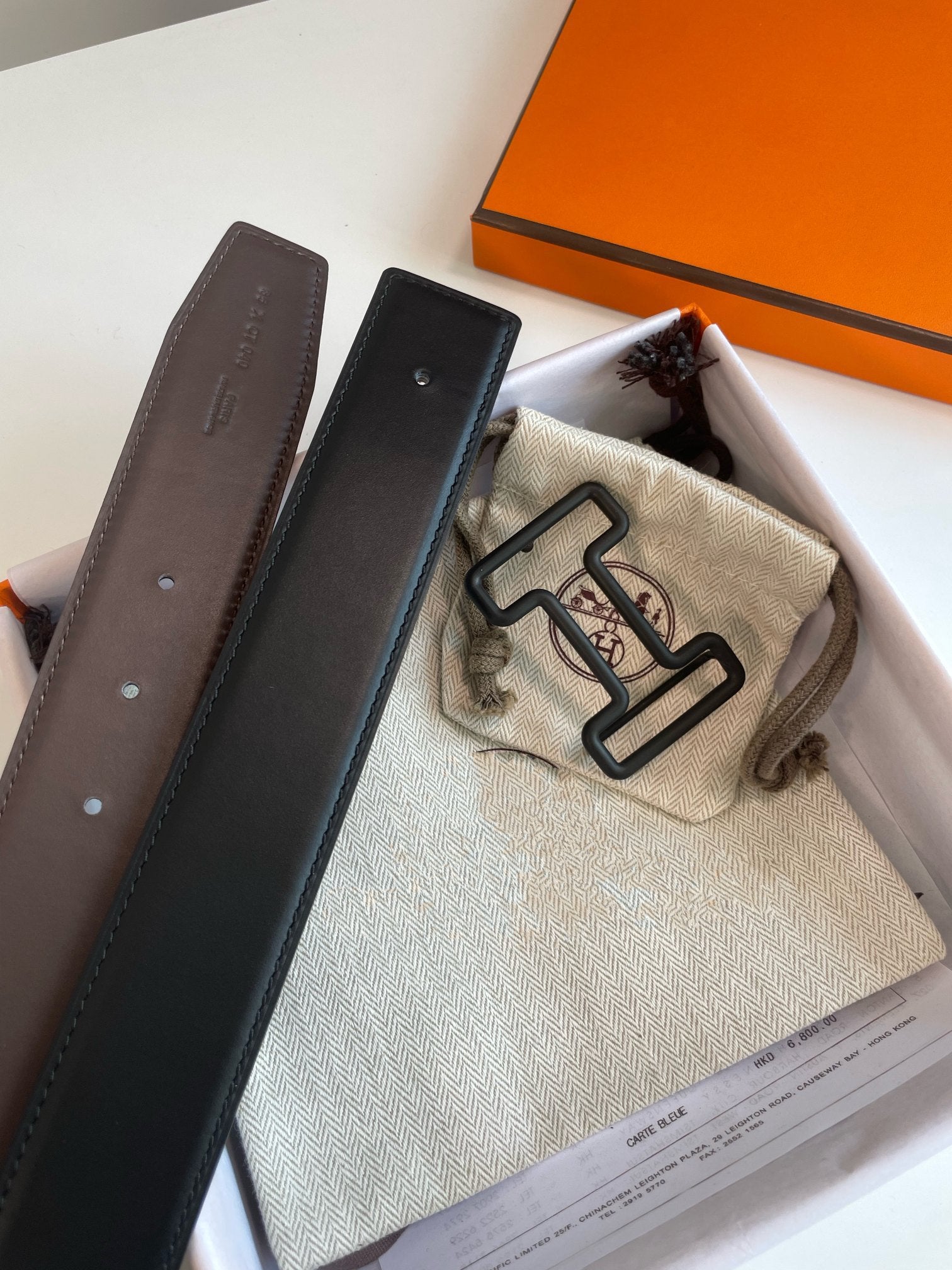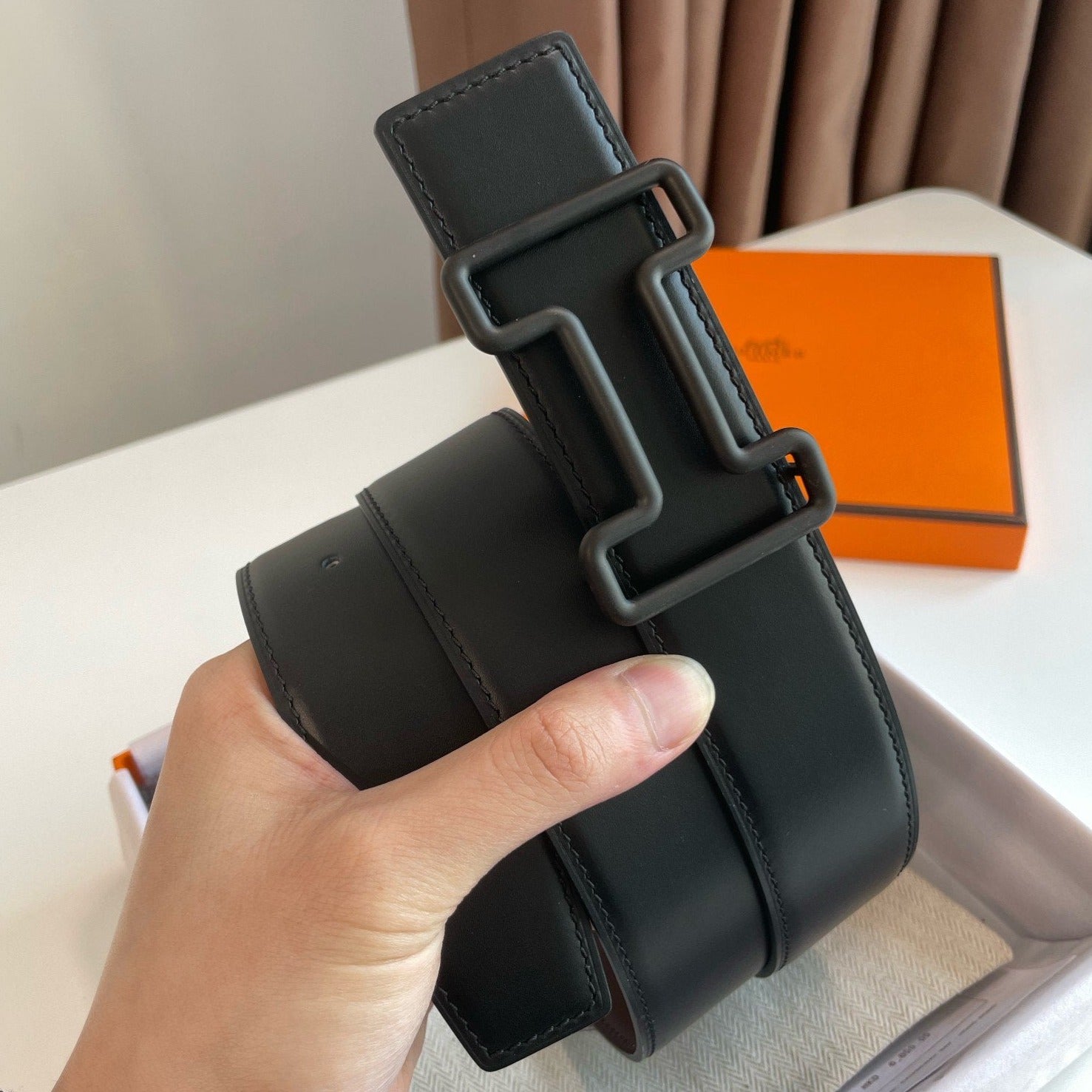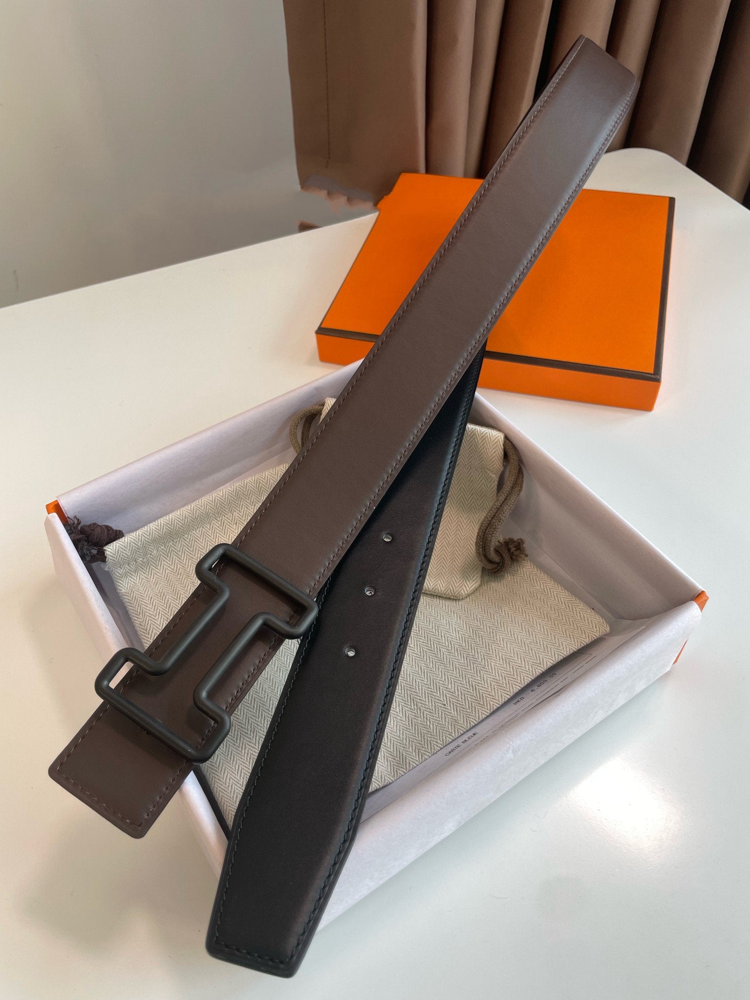 H TONIGHT BELT 38MM BLACK BUCKLE BLACK ETOUPE LEATHER