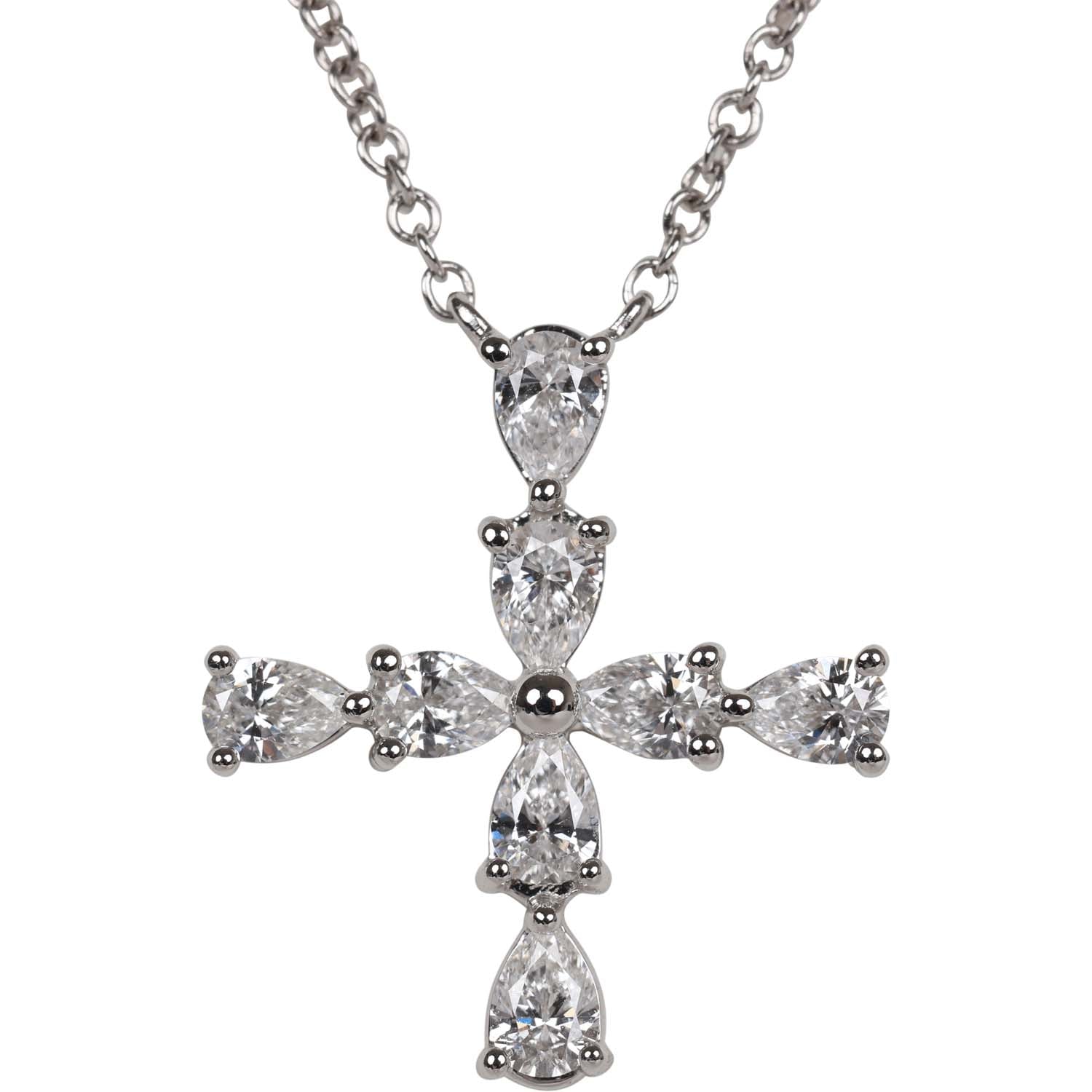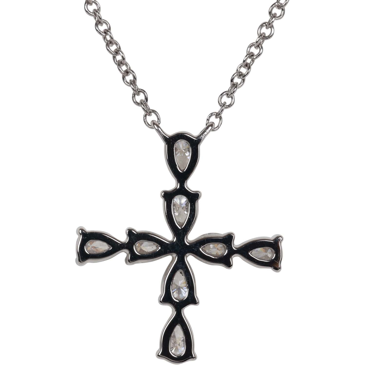 This Harry Winston cross pendant necklace has eight pear shaped diamonds weighing a total of 0.48 carats, set in platinum and with a lobster clasp closure.
