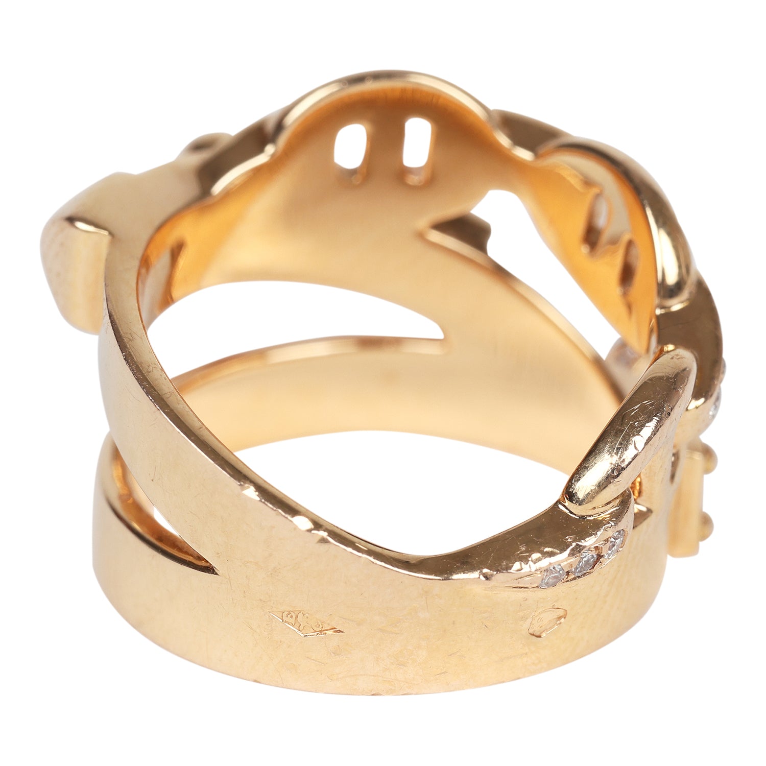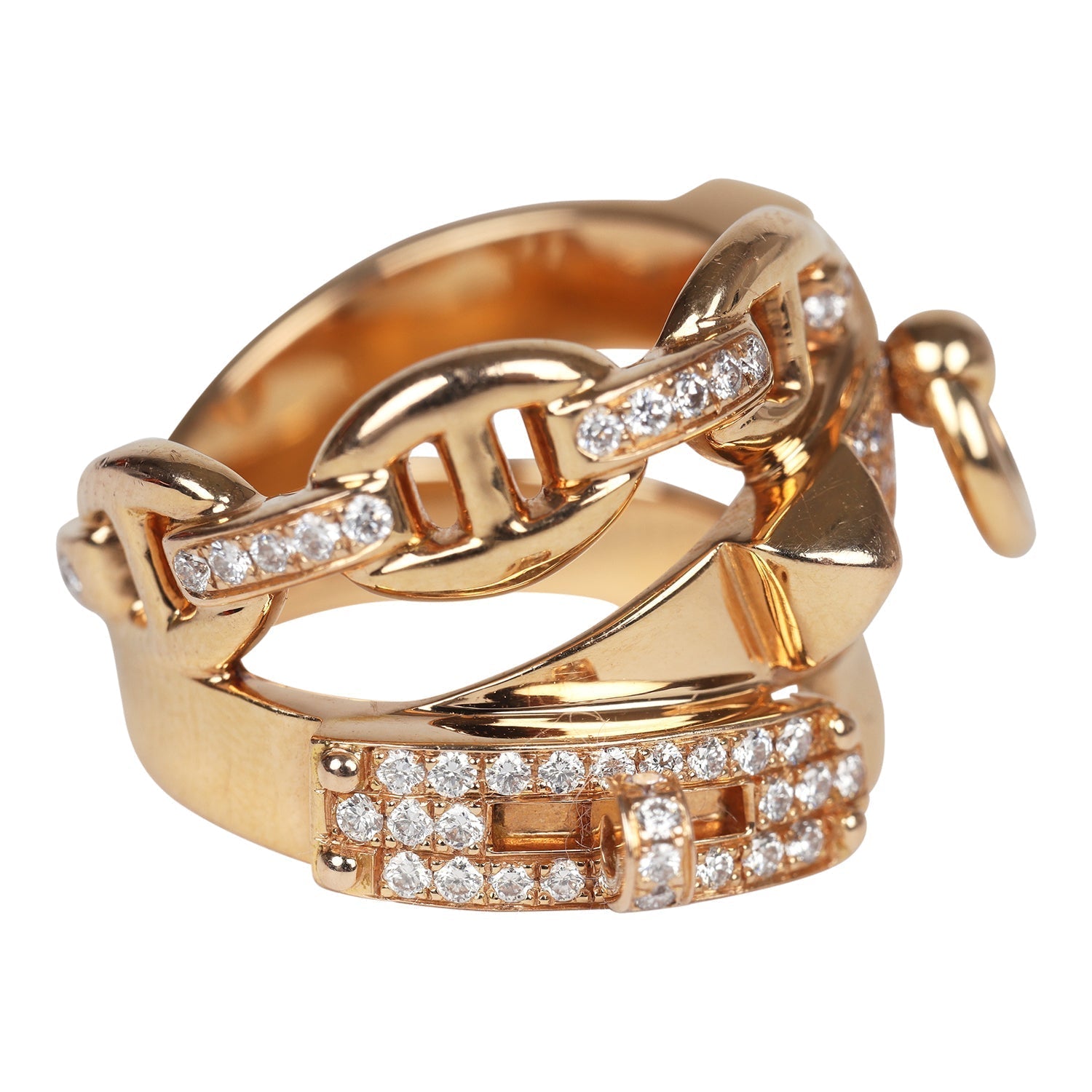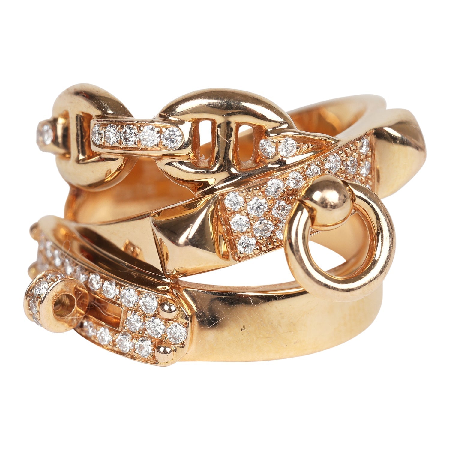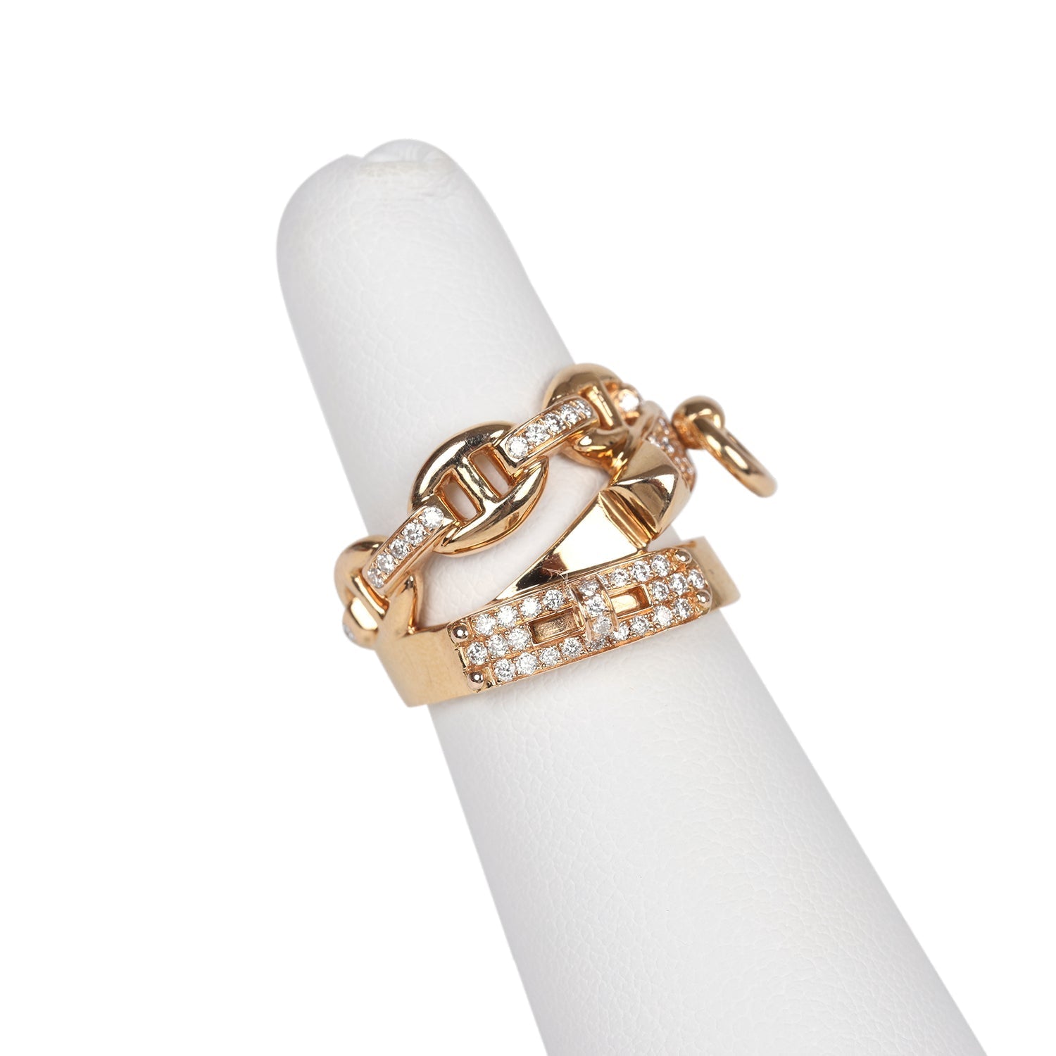 This Hermes Alchimie Ring GM is of 18K rose gold and diamonds with rose gold hardware and features 18 karat rose gold intertwined bands with the chain d'ancre and Kelly motifs set with 66 .32 carat diamonds.