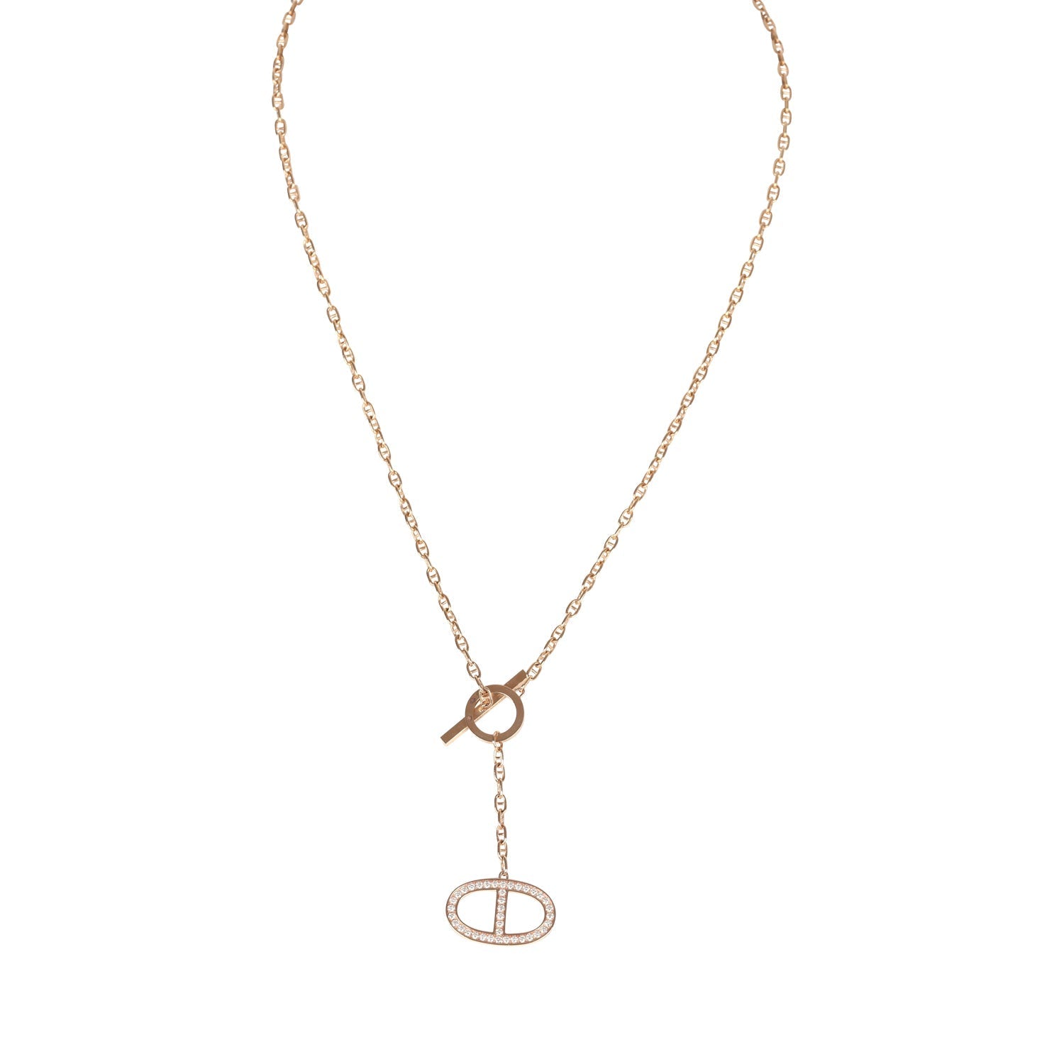 This Hermes Chaine D'Ancre Contour Pendant GM necklace is in 18K rose gold hardware, featuring a chaine d'ancre chainlink necklace with a chaine d'ancre pendant in rose gold set with 38 0.3 carat diamonds and has a bar and toggle closure.