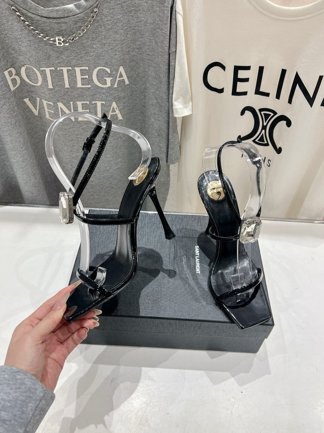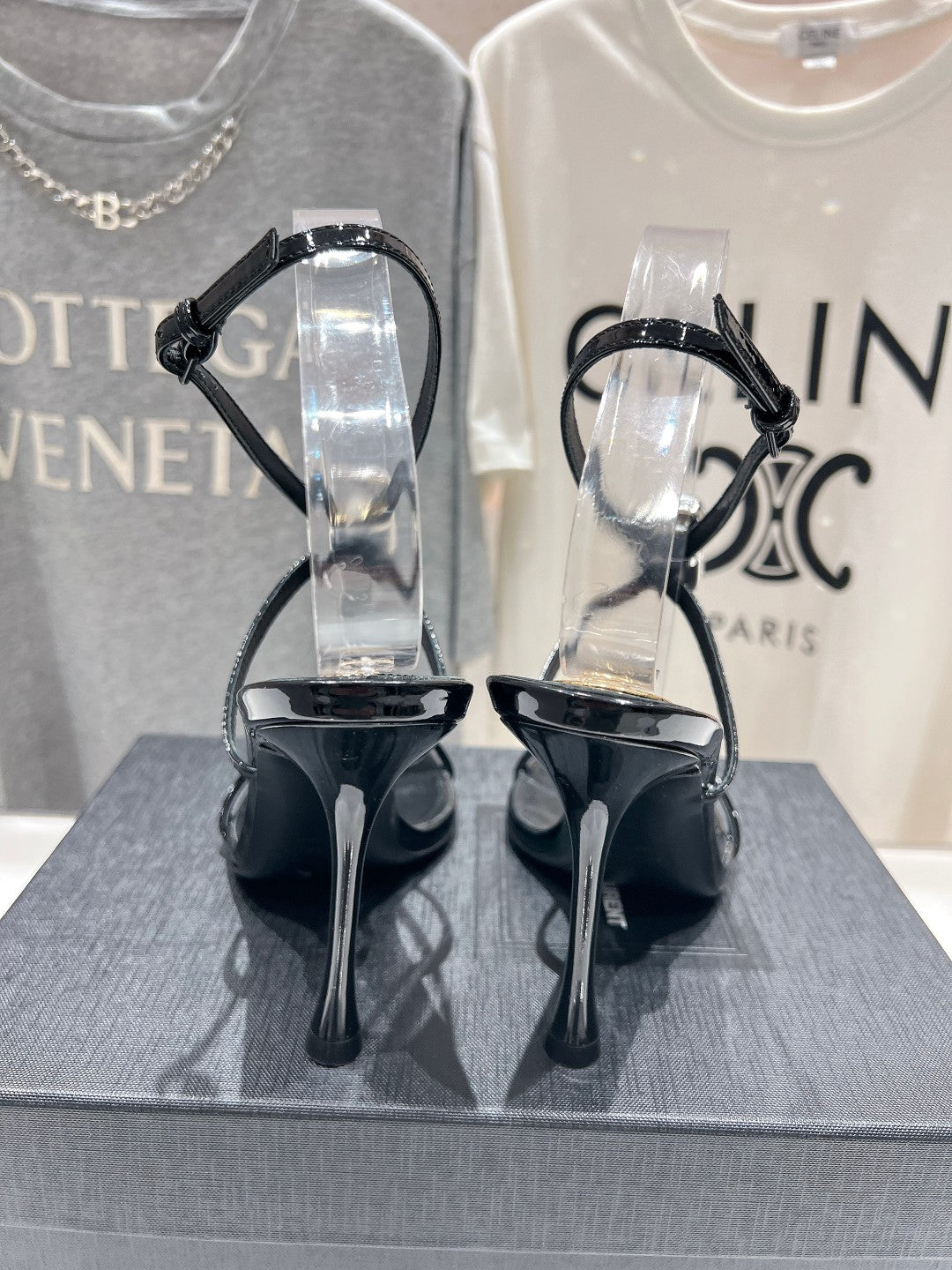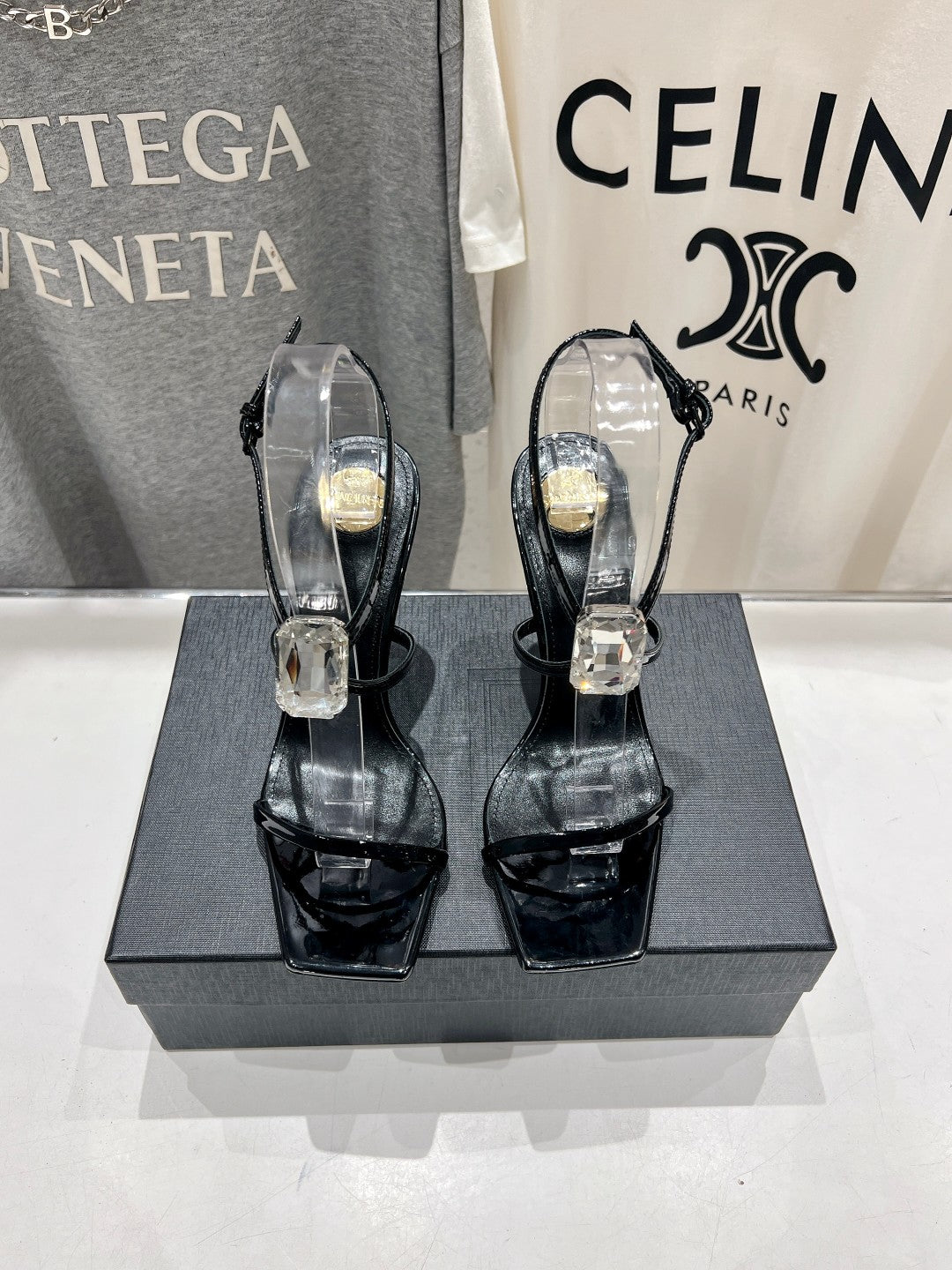 HIGH HEEL SANDALS IN BLACK GLOSSY CALFSKIN WTH STRAPS ATTACHED GEM