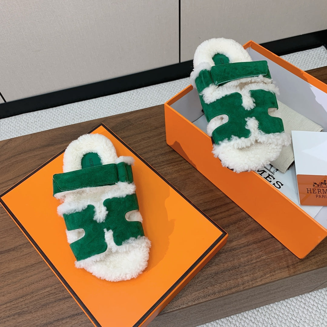 HM Chypre Sandal In Dark Green Mix White Fleece And Suede 984195