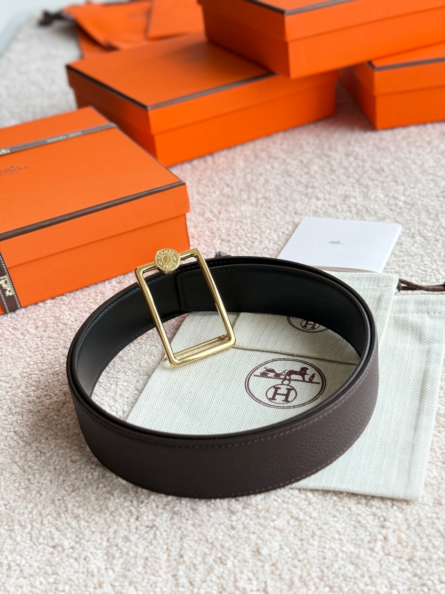 HM Gold Oscar Buckle Belt 38mm Black Chocolate Leather 187785