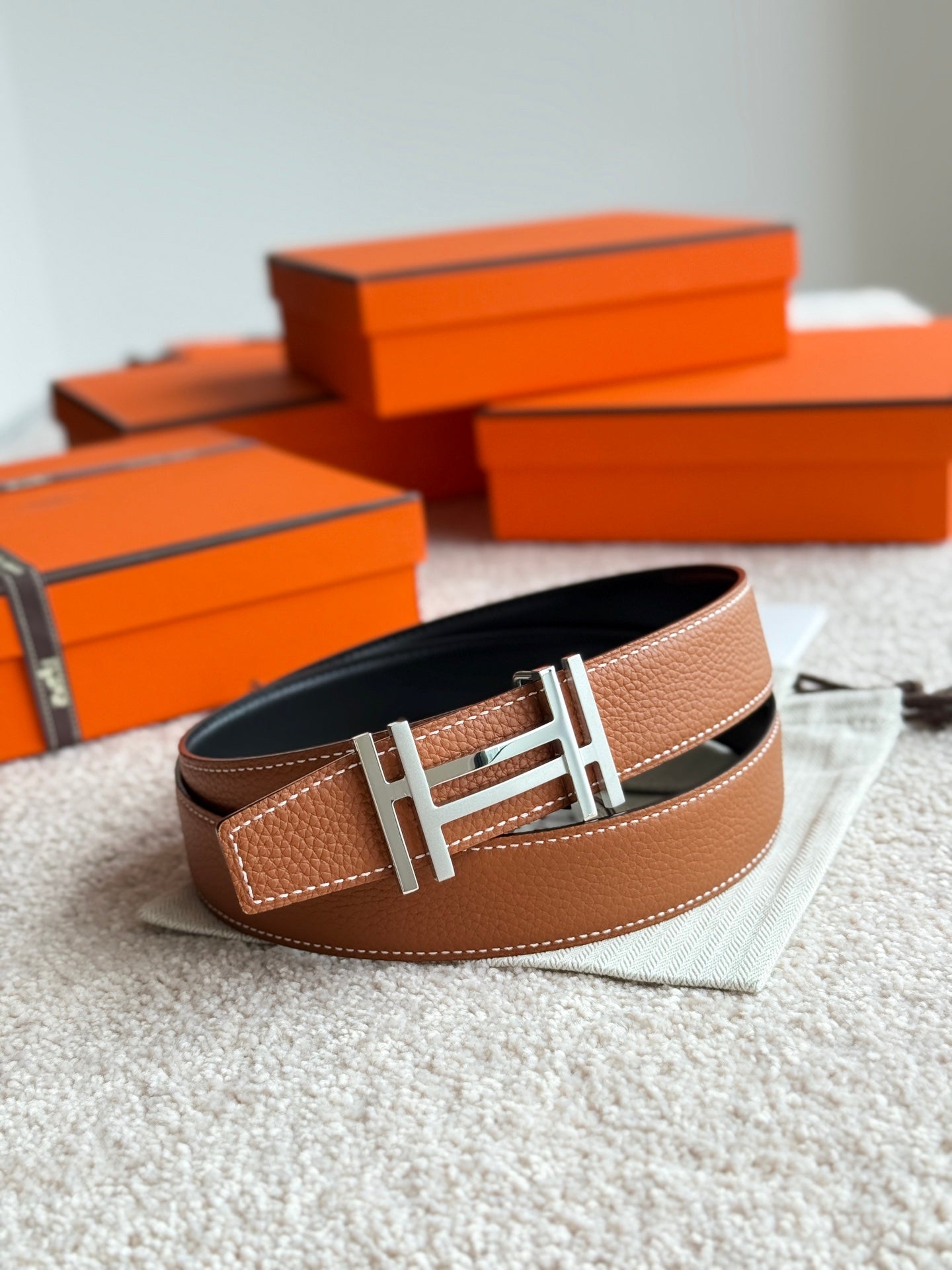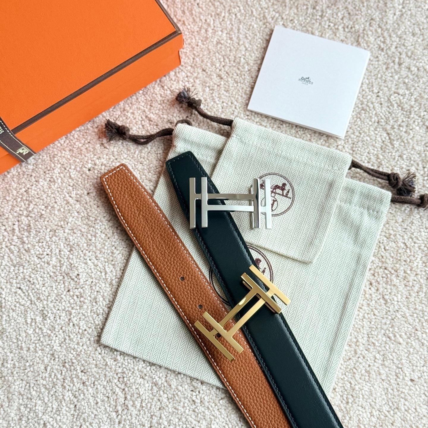 HM H au Carre Buckle Belt 32mm Black Brown Leather 187767