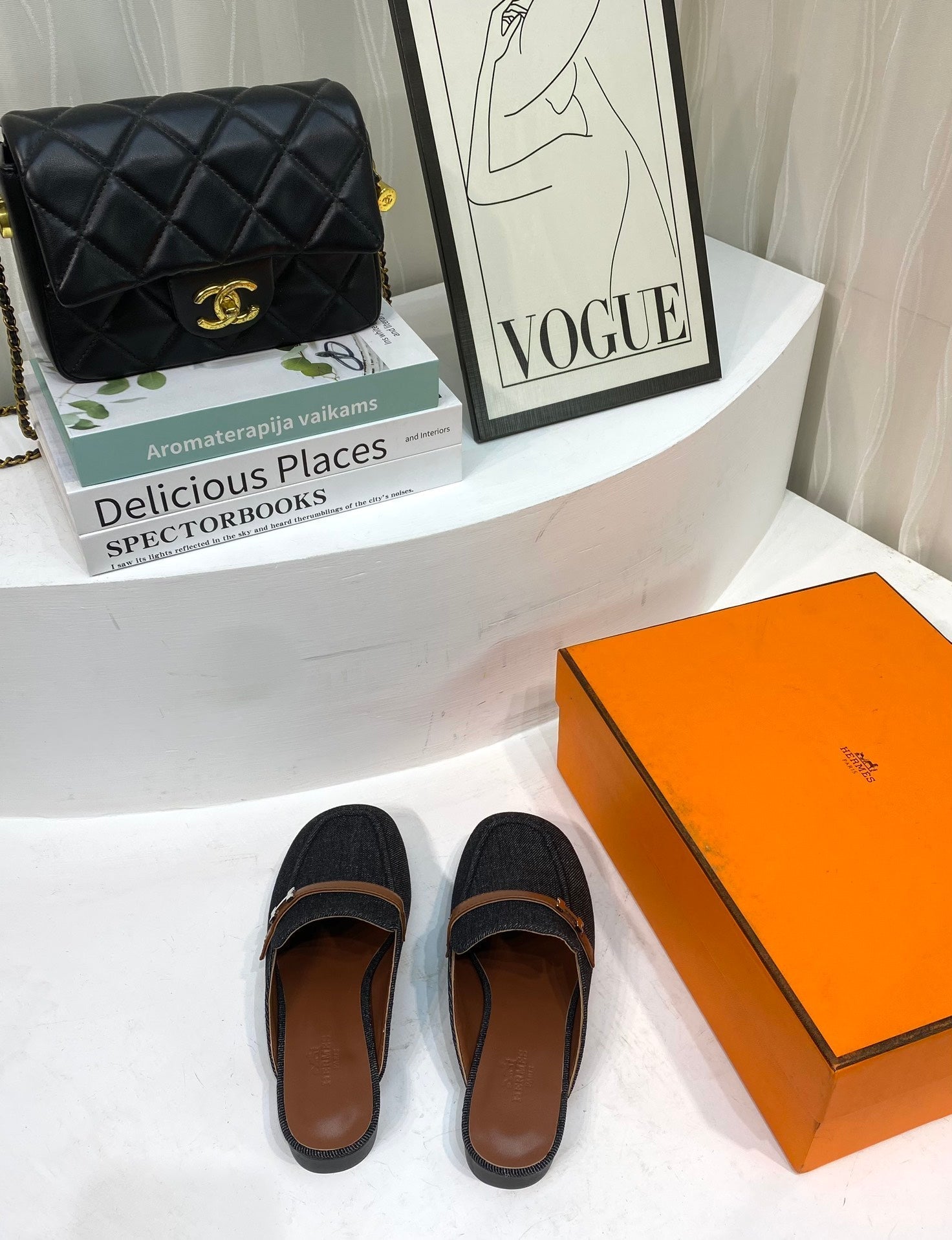 IENA MULE BLACK CANVAS AND BROWN CALFSKIN
