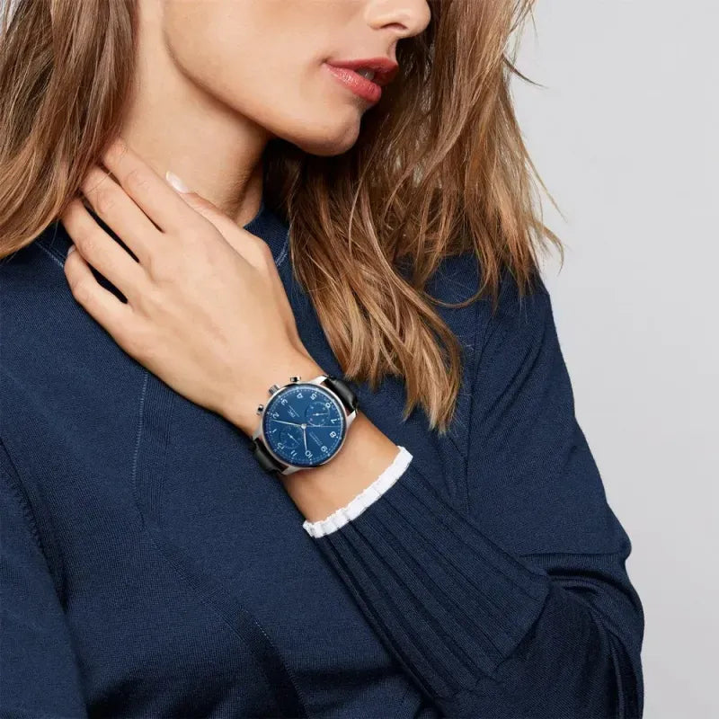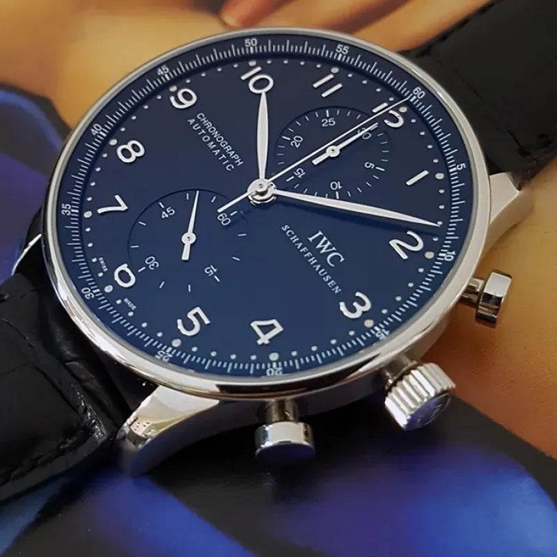 IWC Portugieser Chronograph (IW371606) Men's Watch with 41.00mm stainless steel case, blue dial, rhodium plated hands and numerals, black alligator leather strap and stainless steel deployant buckle. The new IWC automatic movement Caliber 69355 features hours, minutes, a sub-seconds subdial at 6:00 and a chronograph. The watch has a 46-hour power reserve and is water-resistant to 3 bar.