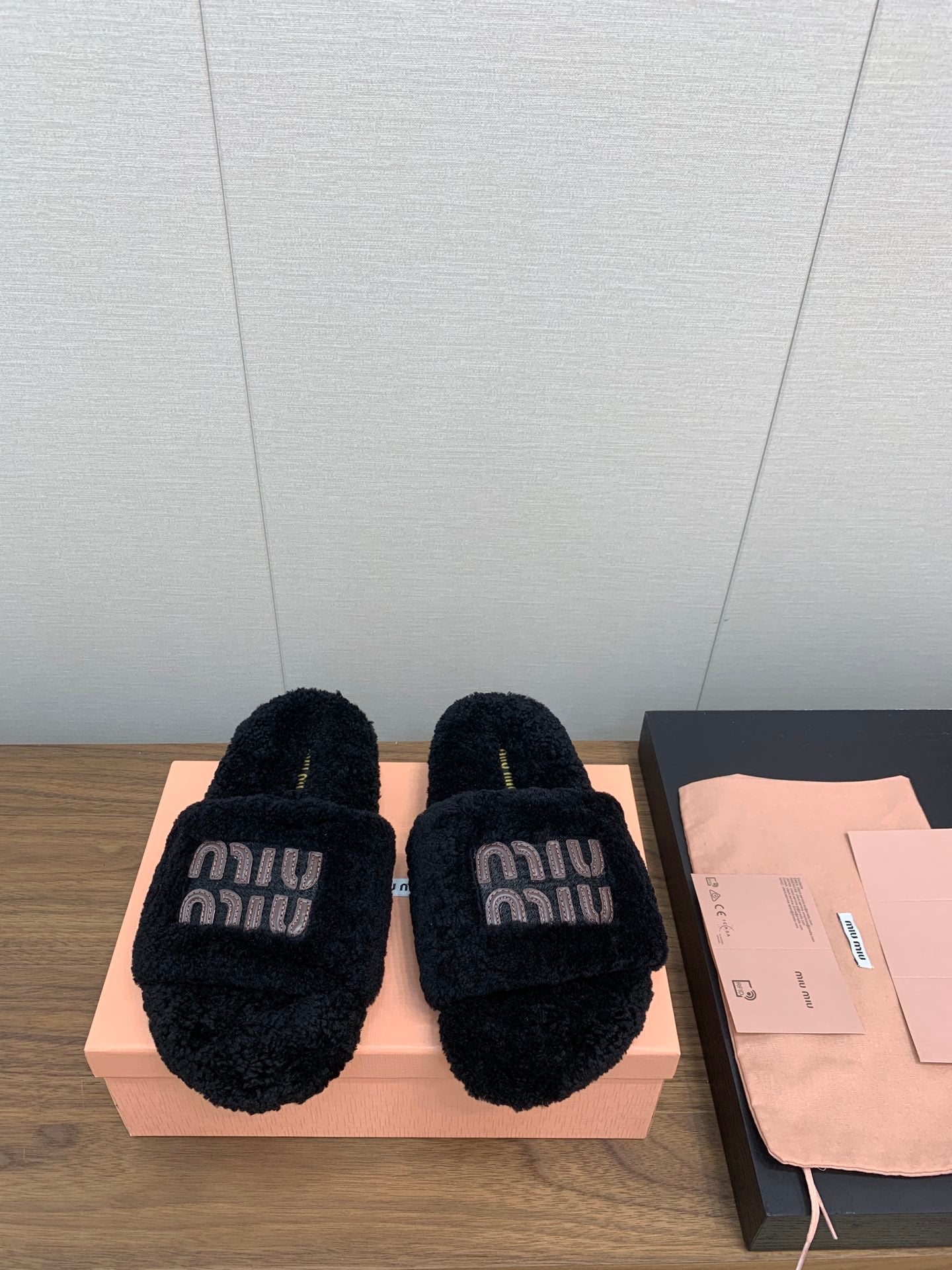 Miu Slippers Black With Brown Text Pure Wool