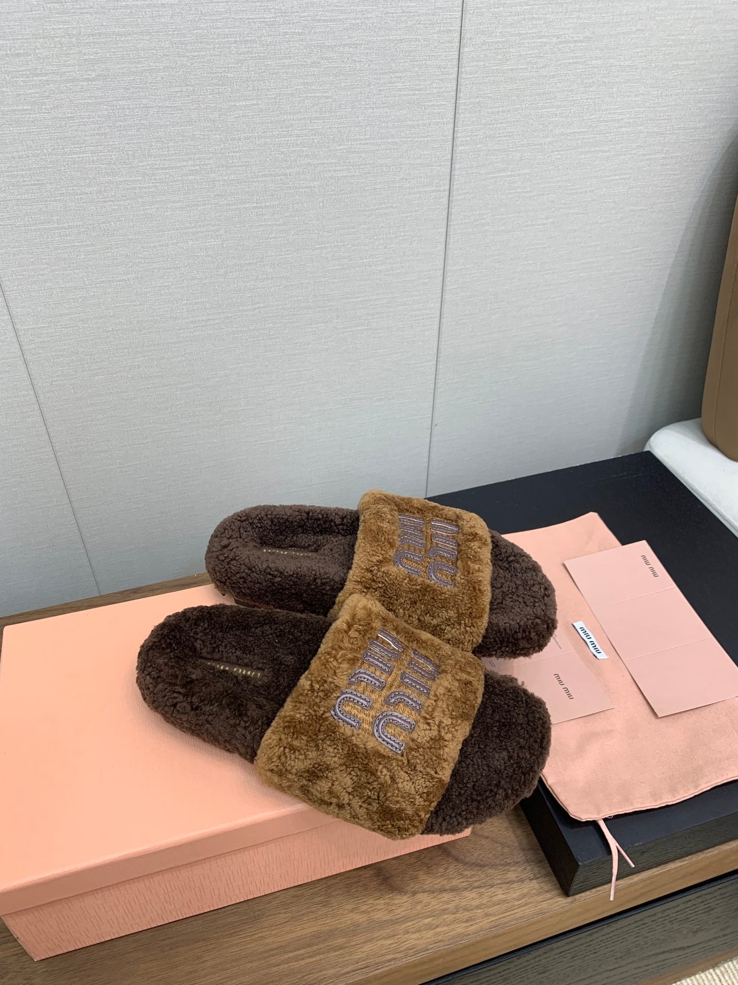 Miu Slippers Caramel Brown With Brown Lettering Pure Wool