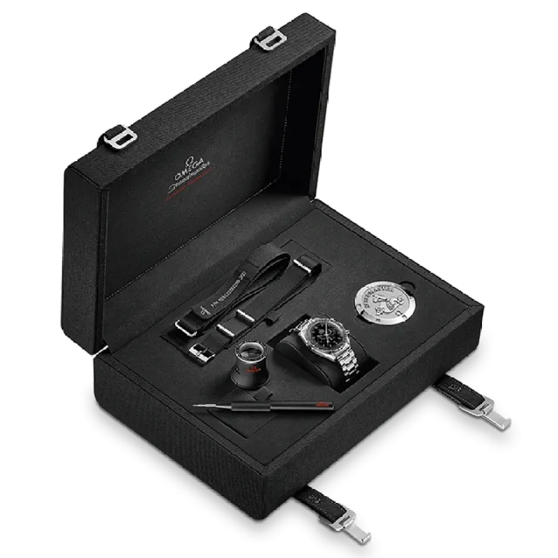 At the heart of this chronograph is OMEGA’s mechanical calibre 1861, a descendent of the legendary manual-winding movement worn on the Moon. This timepiece is offered with a special Moonwatch presentation box which contains a "NATO" strap, a strap for astronauts, a tool to change the bracelet and a book highlighting Speedmaster's