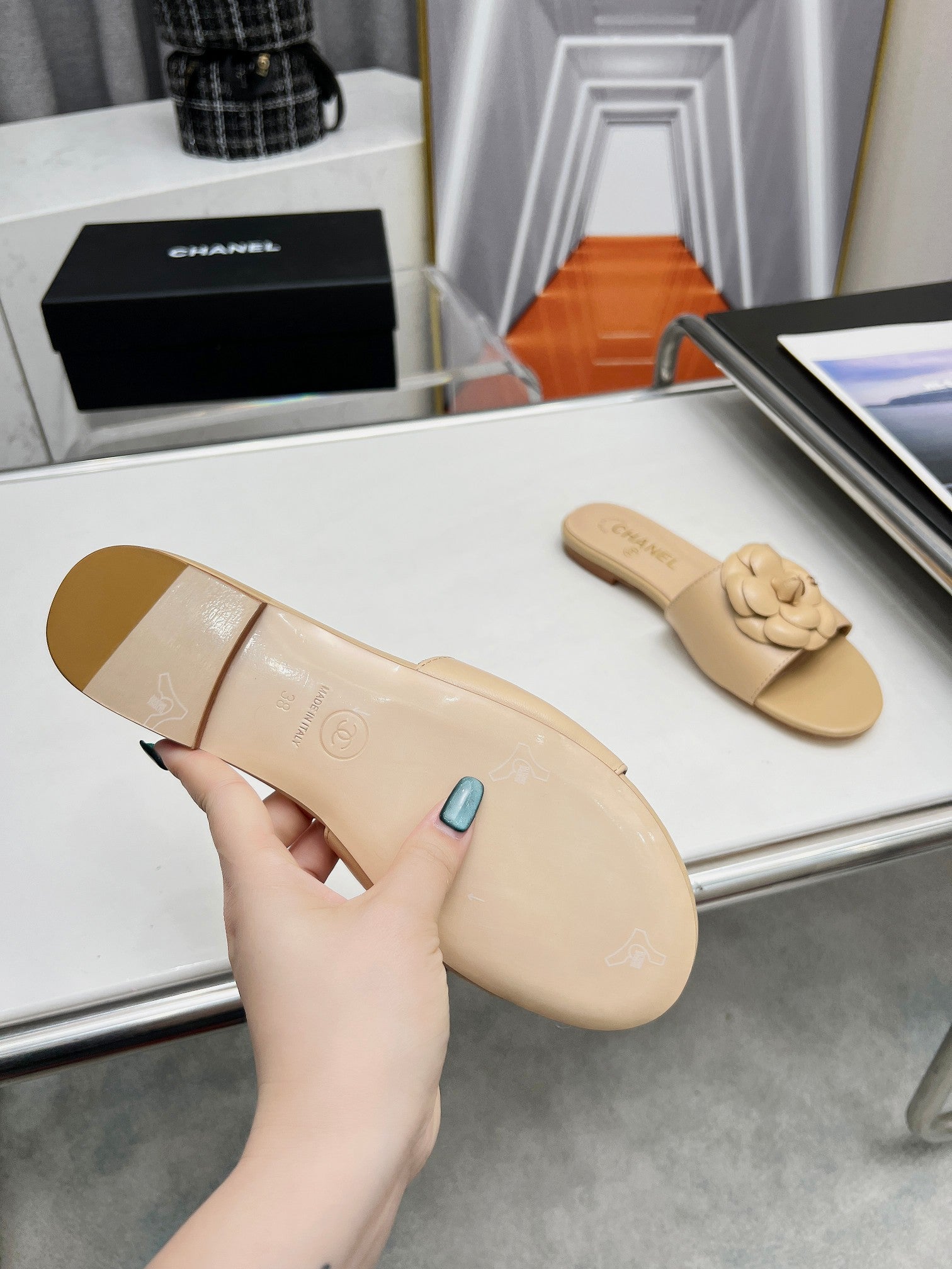 mule sandal flower beige calfskin