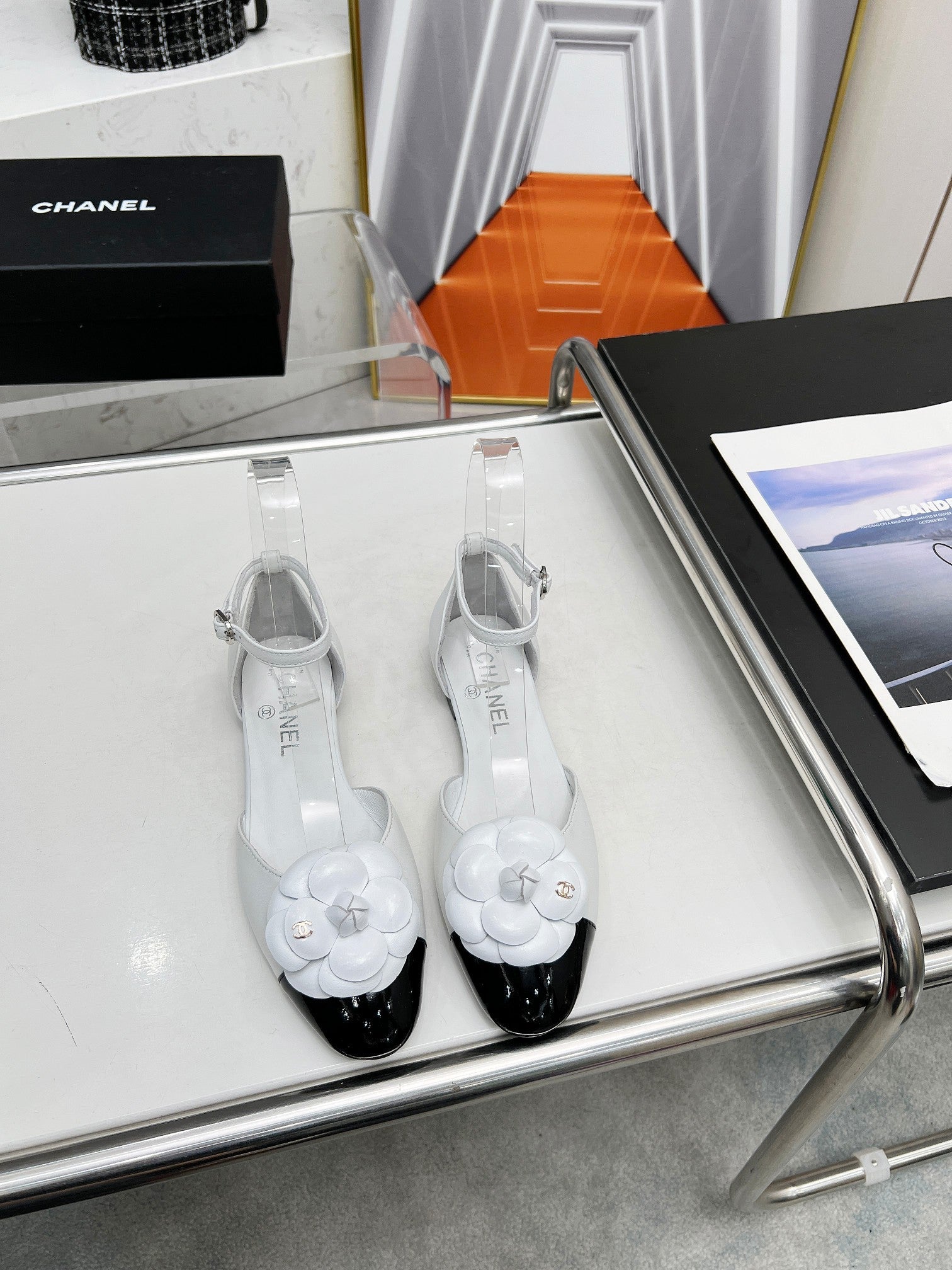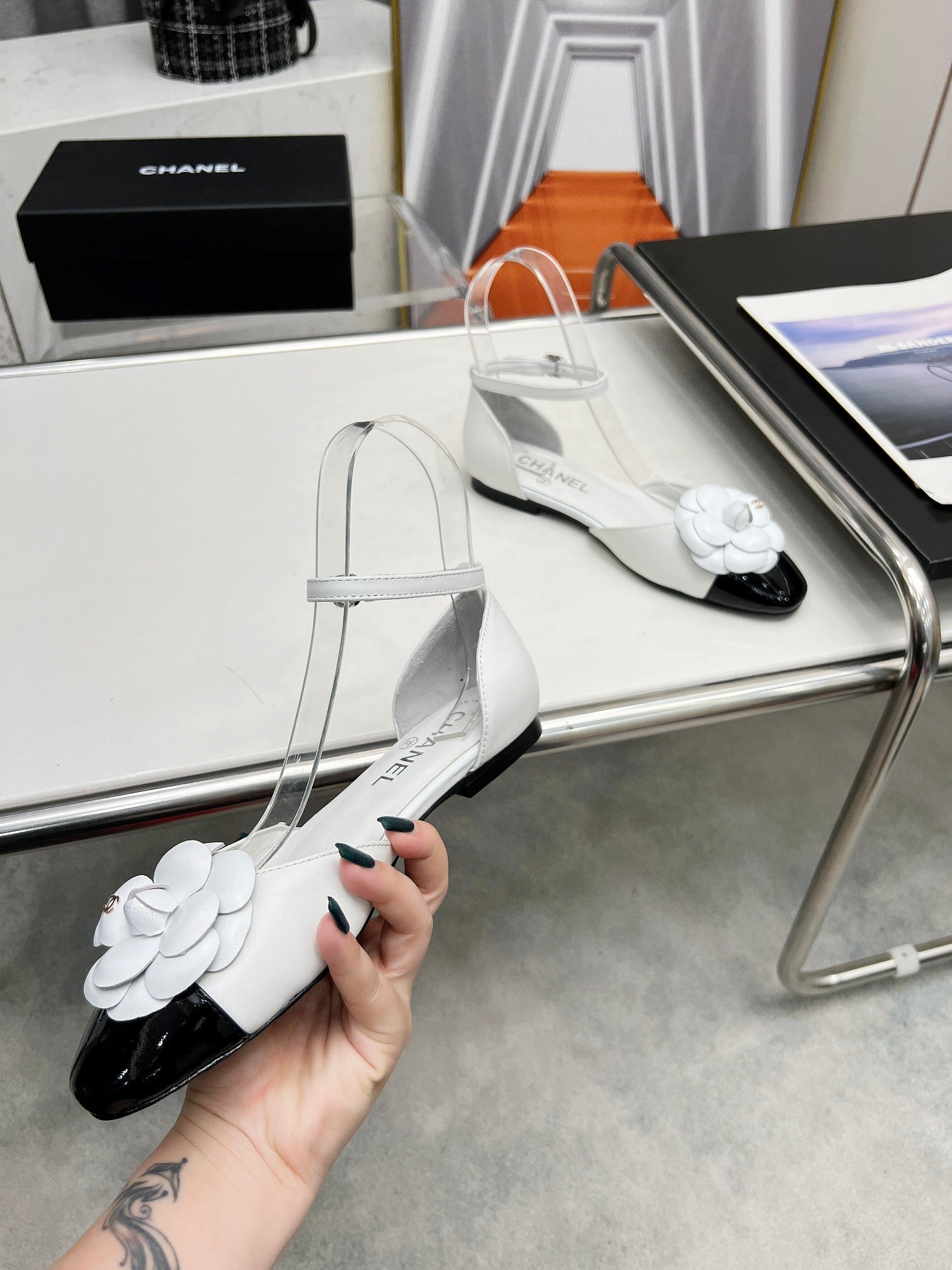 mule sandal flower wedge heel white black calfskin