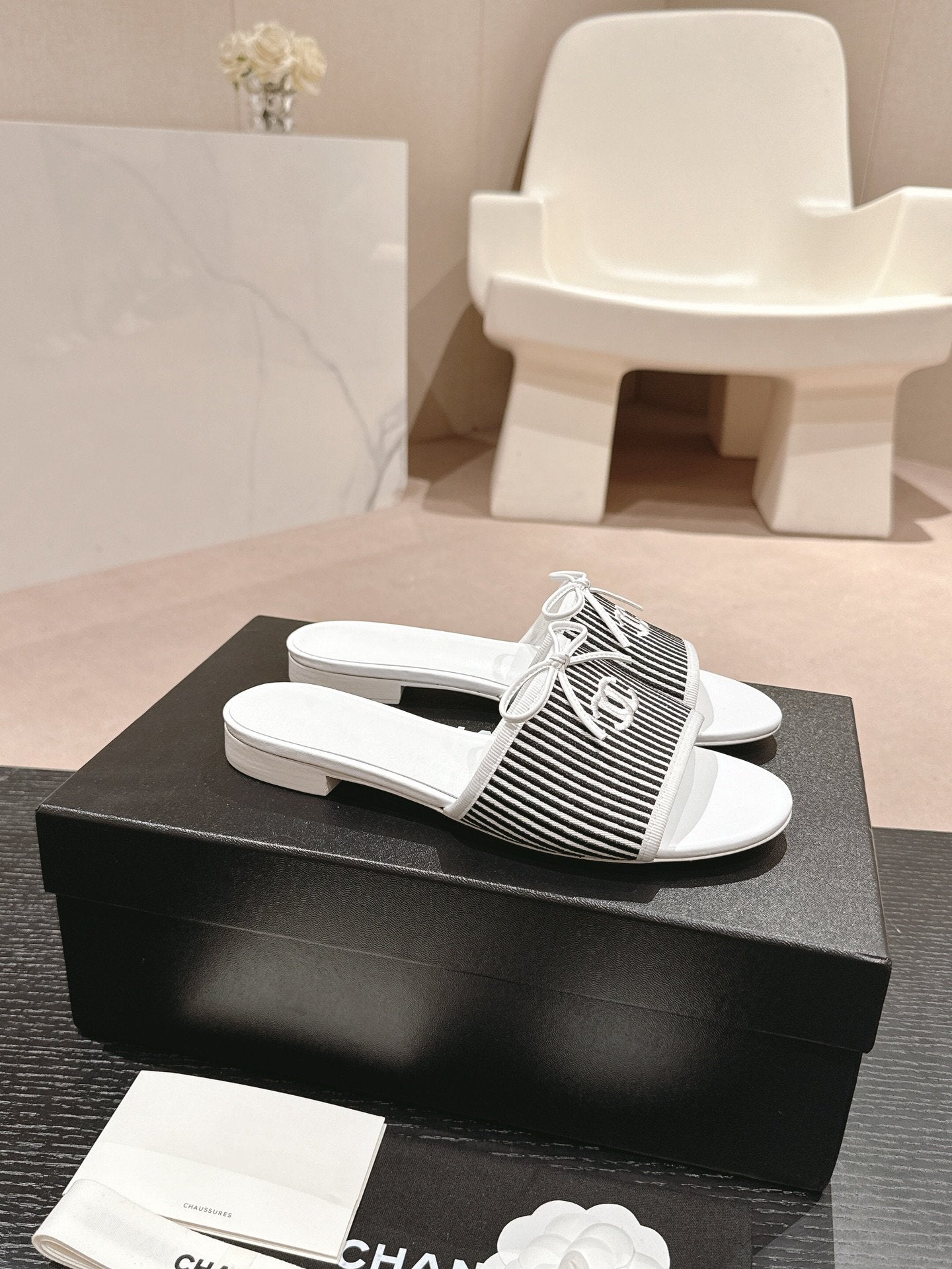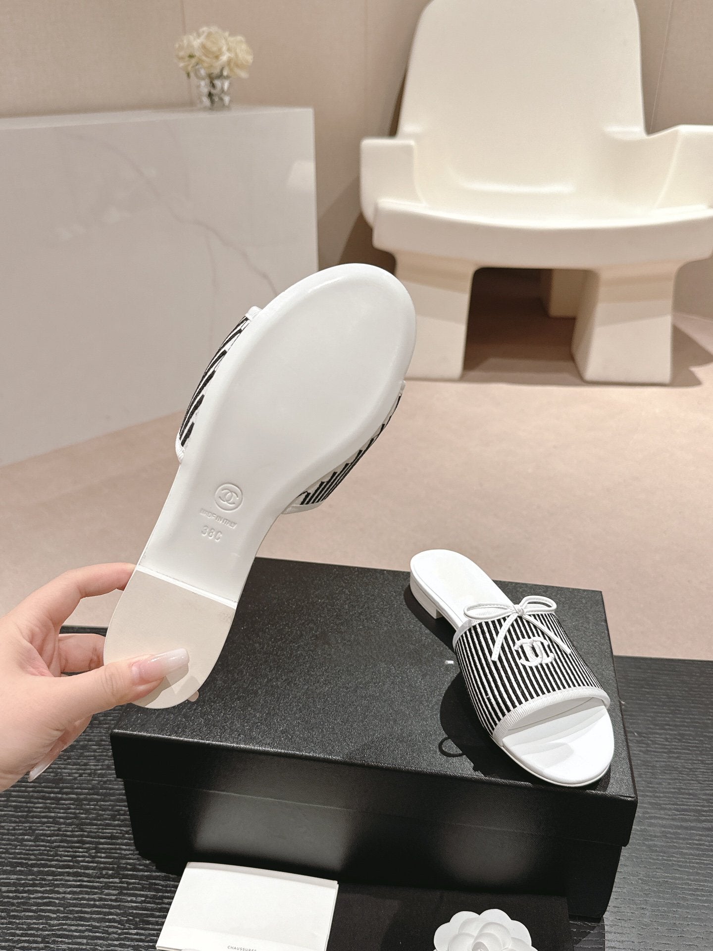 mule sandal striped black white canvas calfskin